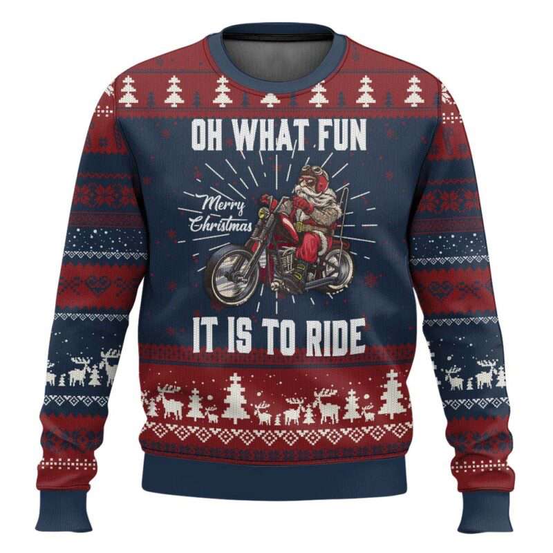 Rev up your holiday spirit with the Santa Claus Oh What Fun It Is To Ride Ugly Christmas Sweater. Featuring St. Nick on a motorcycle, this bold design links festive cheer with biker culture and playful tradition. Perfect for parties, gifting, and showing off your unique style, it unites humor, history, and Christmas joy.
