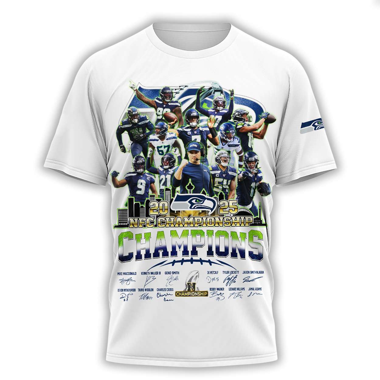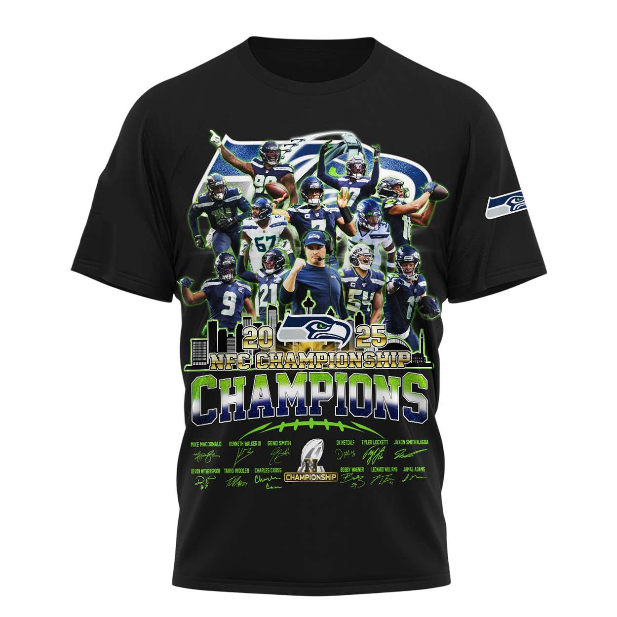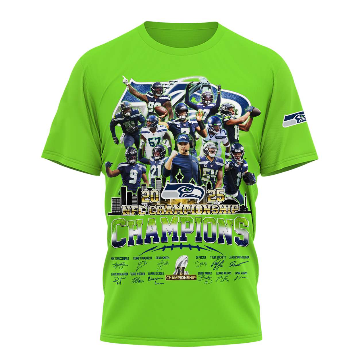 The shirt showcases a dynamic collage of Seattle Seahawks stars, including Geno Smith, DK Metcalf, and Bobby Wagner, frozen mid-action. Each name and signature reflects a season of resilience, unity, and electrifying plays that defined the 2025 championship run.