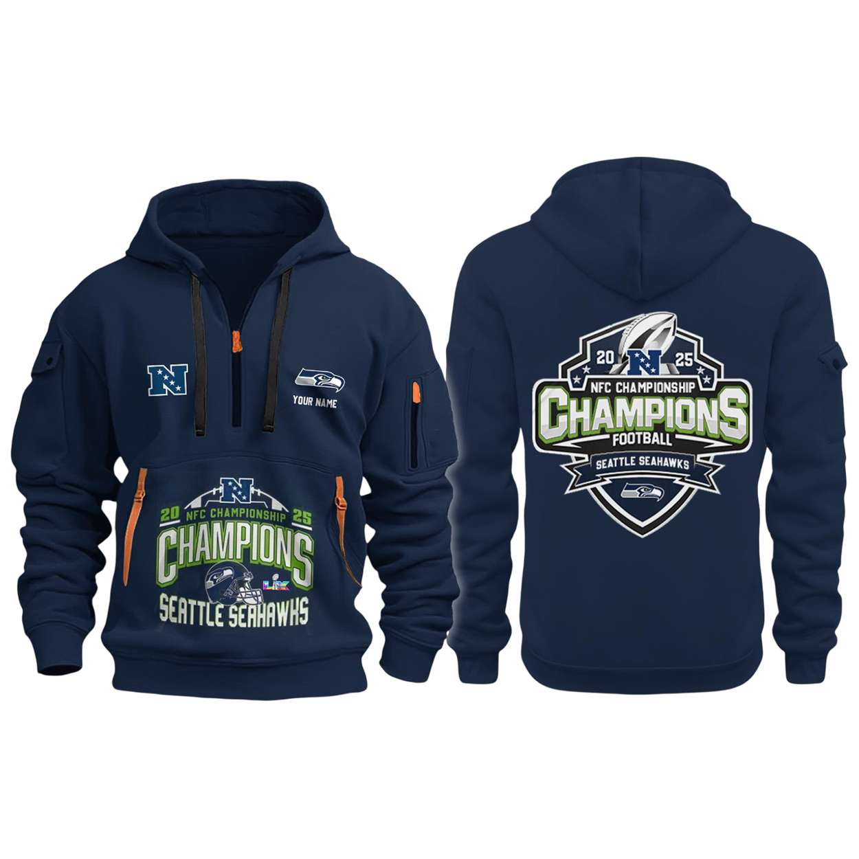 The front design immortalizes the Seahawks’ 2025 NFC Conference victory, a season defined by grit and comeback spirit. With “YOUR NAME” featured, it invites fans to feel part of the journey that electrified Seattle and inspired football communities nationwide.