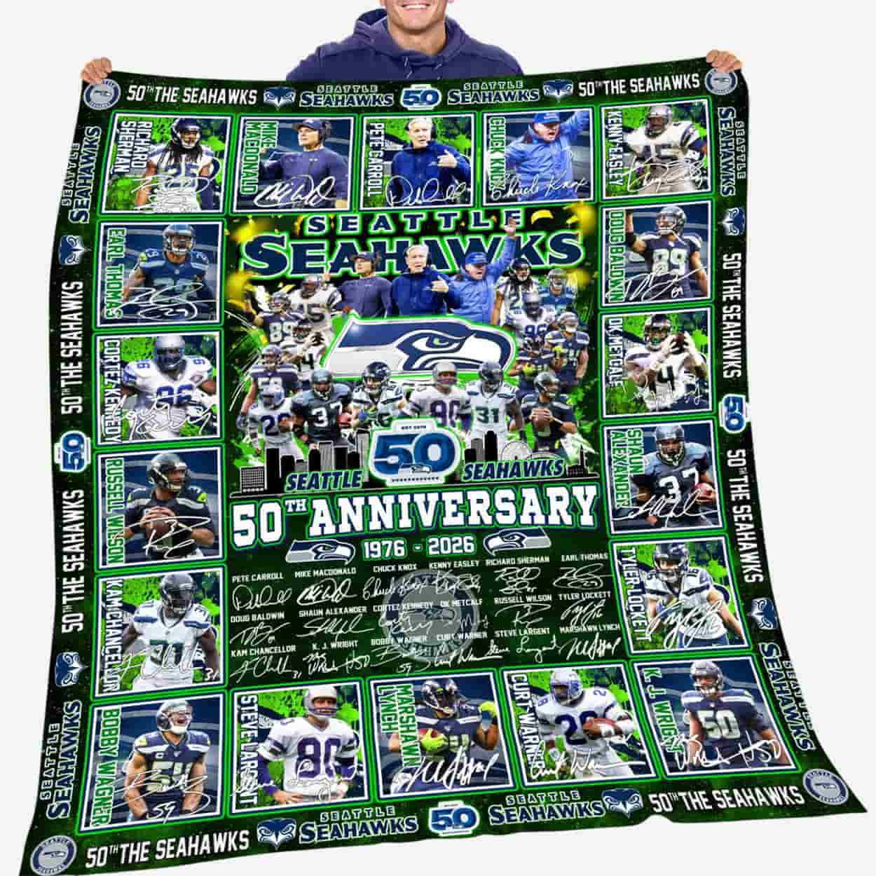 Honor five decades of Seattle Seahawks legacy with the Seahawks 50th Anniversary 1976-2026 Blanket. Featuring iconic players, coaches, and historic moments, this tribute piece connects fans to the team’s enduring spirit and social impact across generations.