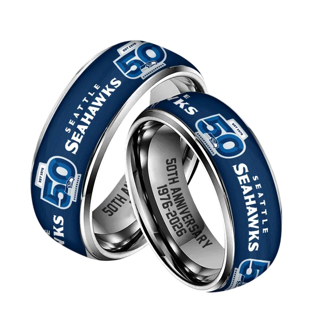 Honor five decades of Seattle Seahawks legacy with the Seahawks 50th Anniversary Custom Ring. Featuring the iconic “EST. 1976” and bold team insignia, this piece pays tribute to unforgettable plays, legendary figures, and the enduring spirit of Pacific Northwest football culture.