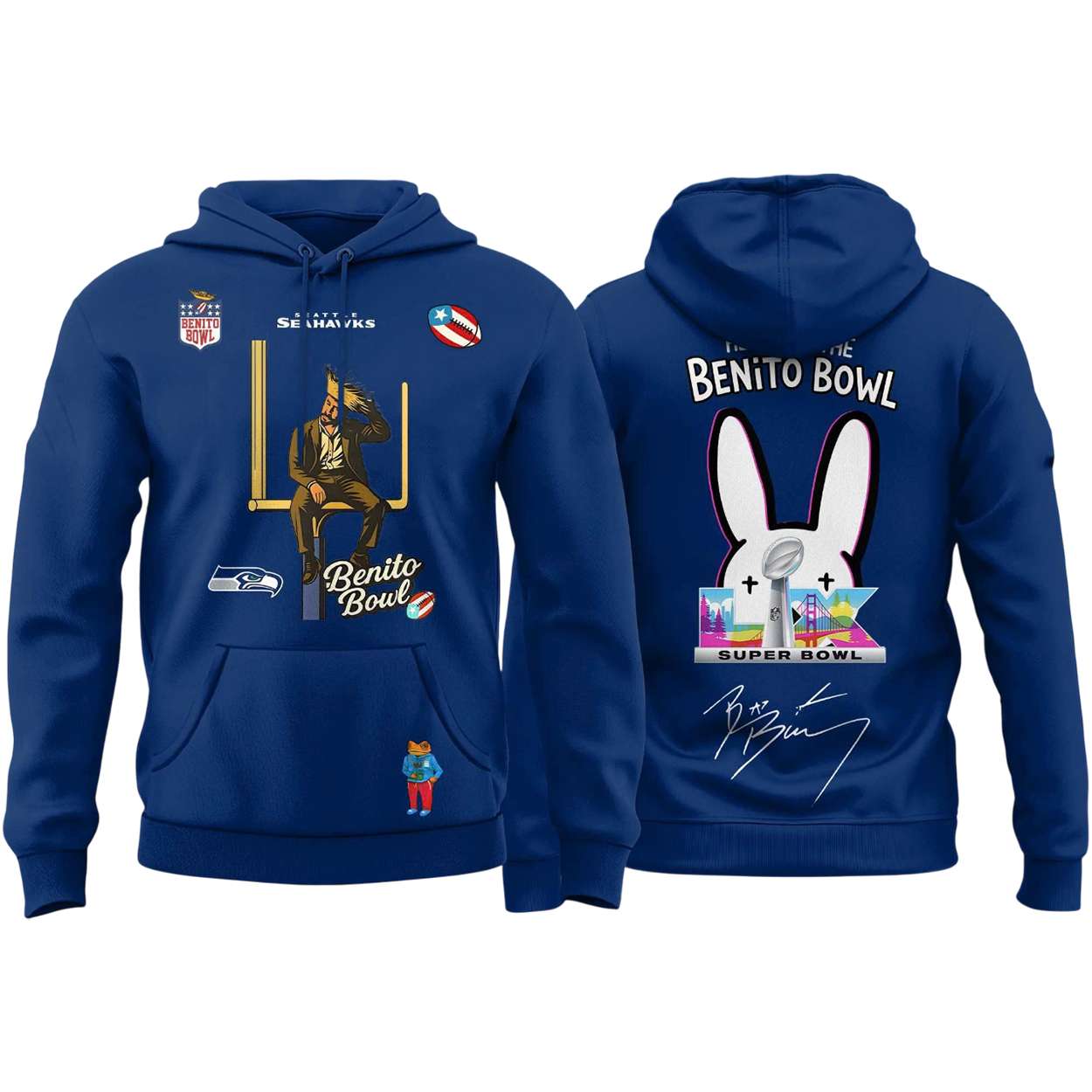 Dive into the fusion of music, sport, and culture with the Seahawks Bad Bunny Benito Bowl 2026 Hoodie. Featuring bold graphics, iconic characters, and Super Bowl 59 themes, this hoodie connects fans to unforgettable moments and global influence.