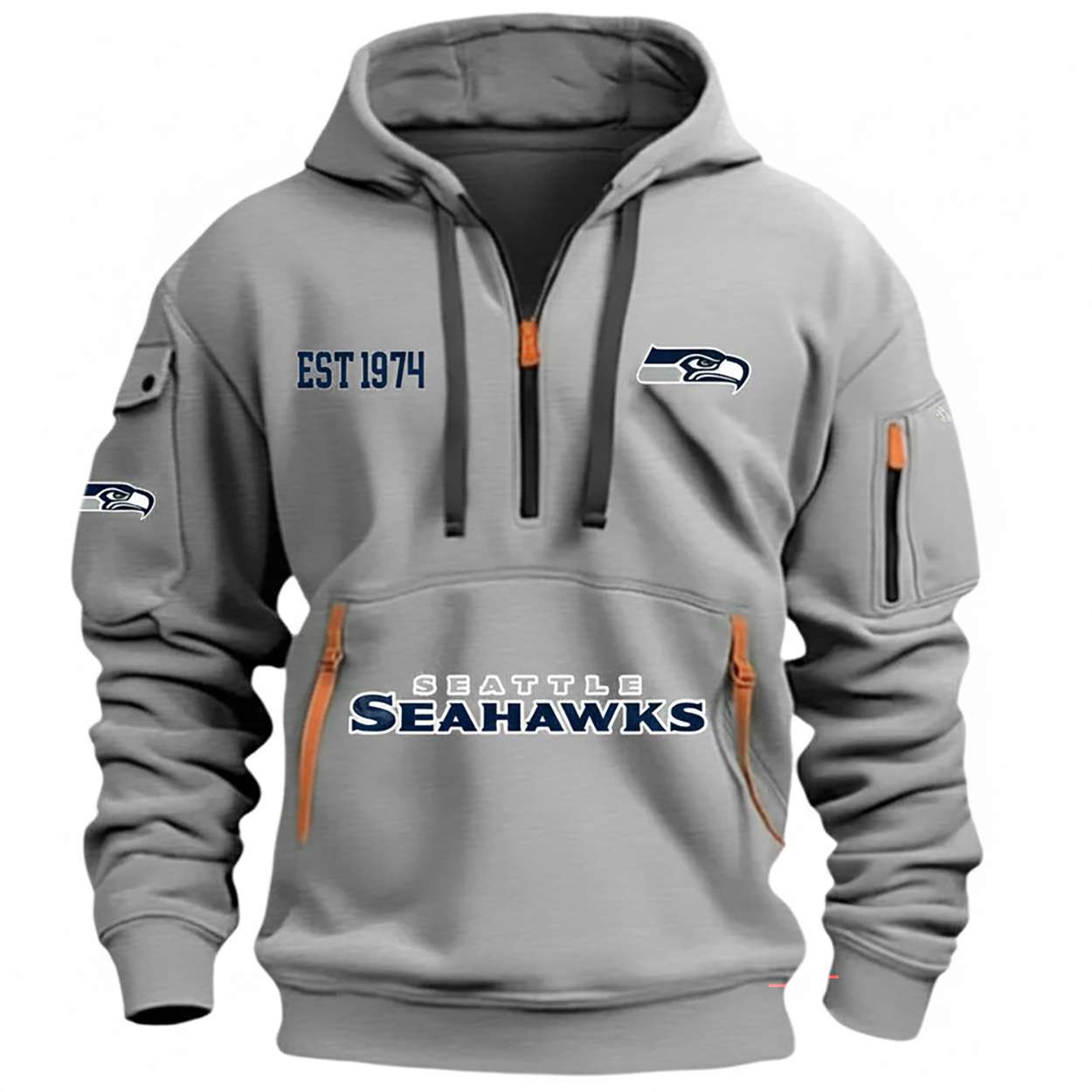 The Seahawks Est 1974 HOODIE HALF ZIPPER honors Seattle’s football legacy with bold graphics and historic flair. Featuring iconic emblems and a nod to the team’s founding year, this hoodie connects fans to decades of grit, unity, and regional pride.
