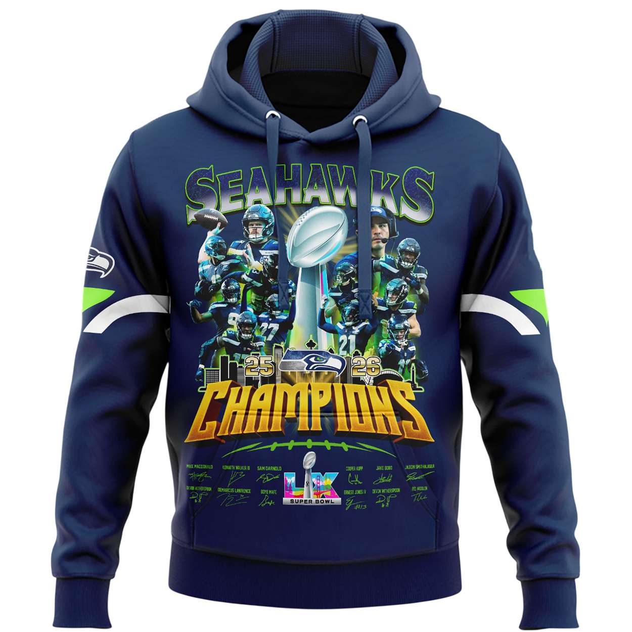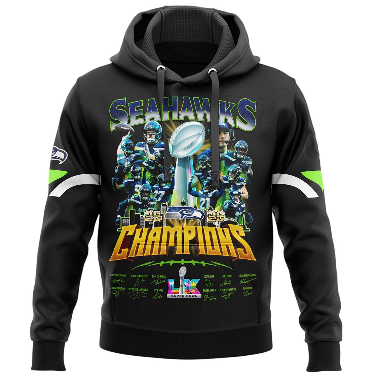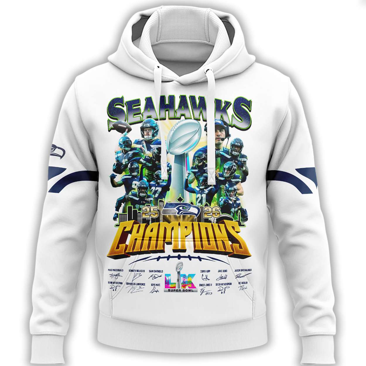 Honor the Seahawks’ 2026 Super Bowl victory with this Seahawks Super Bowl 2026 Champions Hoodie. Featuring bold graphics, player signatures, and historic game references, it connects fans to a cultural moment of unity and perseverance. Perfect for those who value sports heritage, community pride, and enduring achievement.
