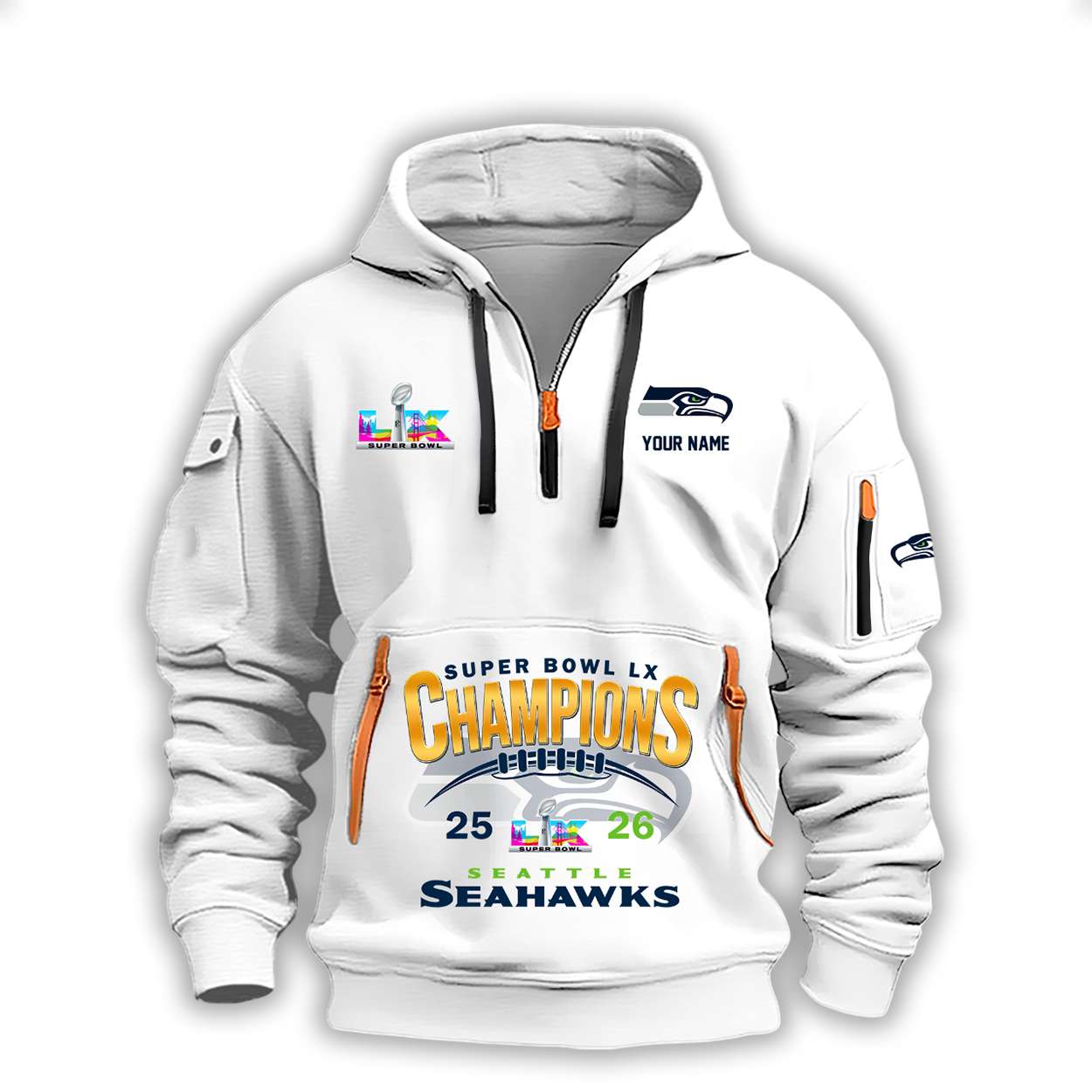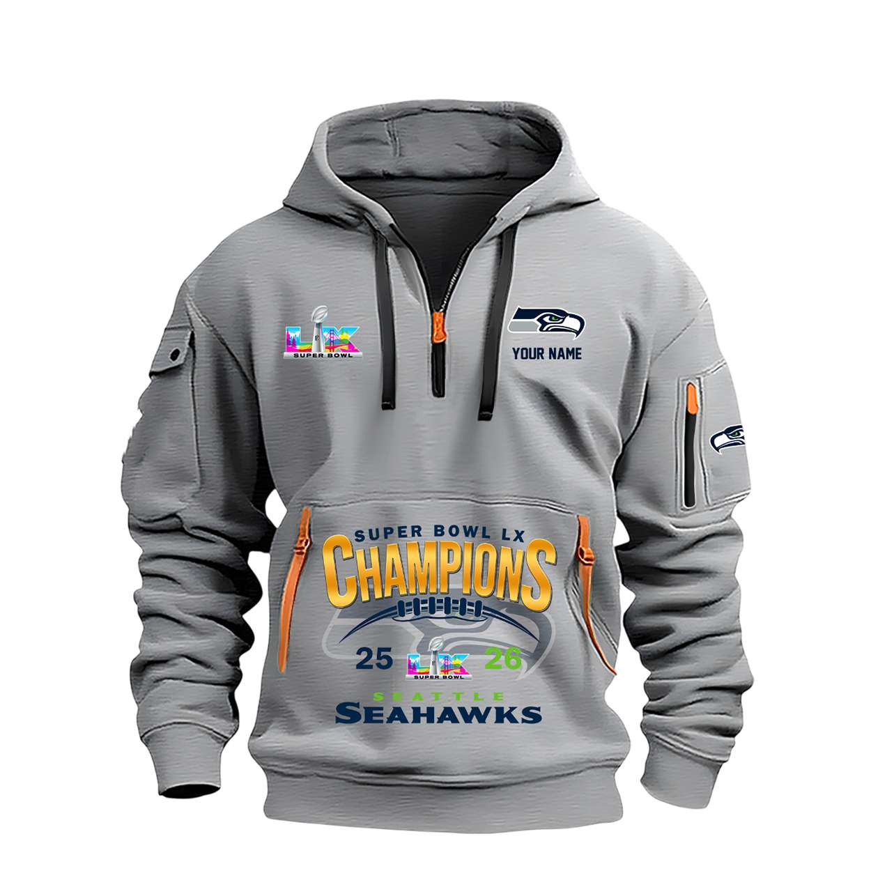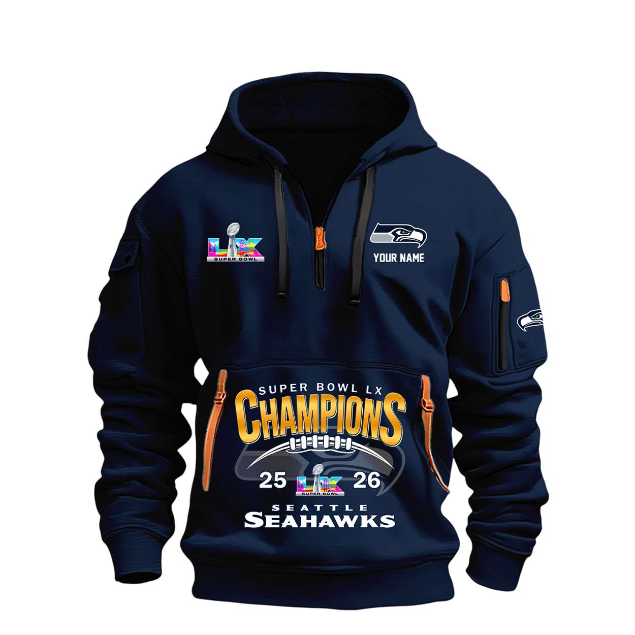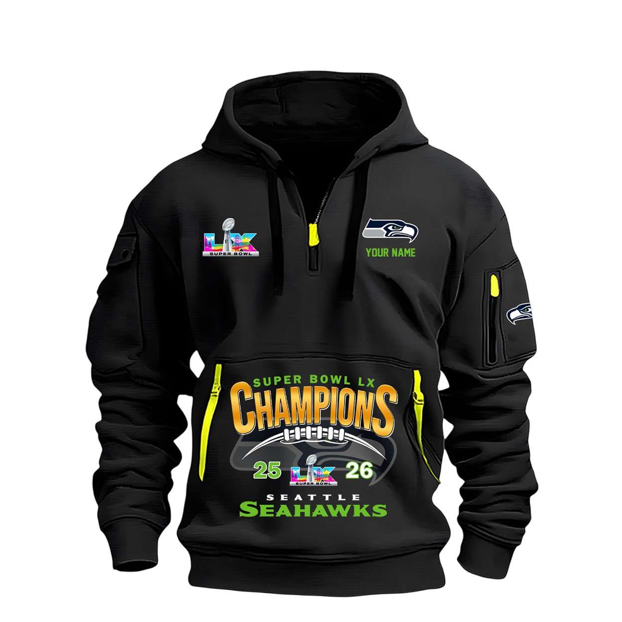 The Seahawks Super Bowl 2026 Champions Quarter Zip Hoodie embodies the grit and determination that defined Seattle’s championship run. Names etched into the design recall the leadership of rising stars and veterans whose performances shaped unforgettable narratives of resilience and victory.