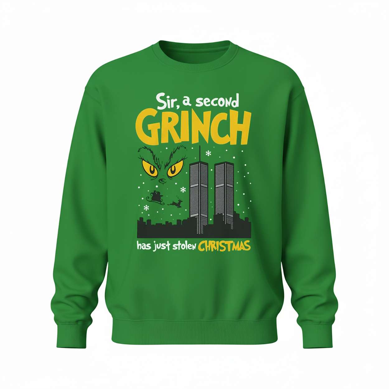This shirt juxtaposes the mischievous Grinch with a skyline silhouette and sleigh, blending satire with cultural memory. The phrase evokes a fictional twist on real events, inviting reflection on how narratives shape public consciousness and seasonal traditions.
