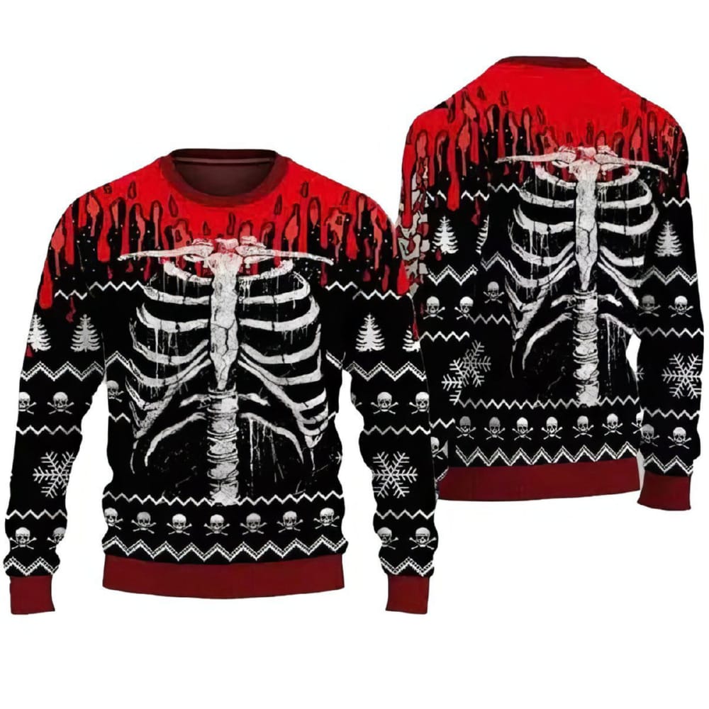 The Skeleton Skull Spooky Ugly Halloween Sweater isn’t just clothing—it’s a narrative woven into fabric. The front displays a ribcage design dripping with crimson, echoing the eerie symbolism of Día de los Muertos altars and gothic art traditions. The bold skeletal chest reminds us of the fragile boundary between life and death, while the red drip effect mirrors imagery found in classic vampire folklore and old horror cinema.