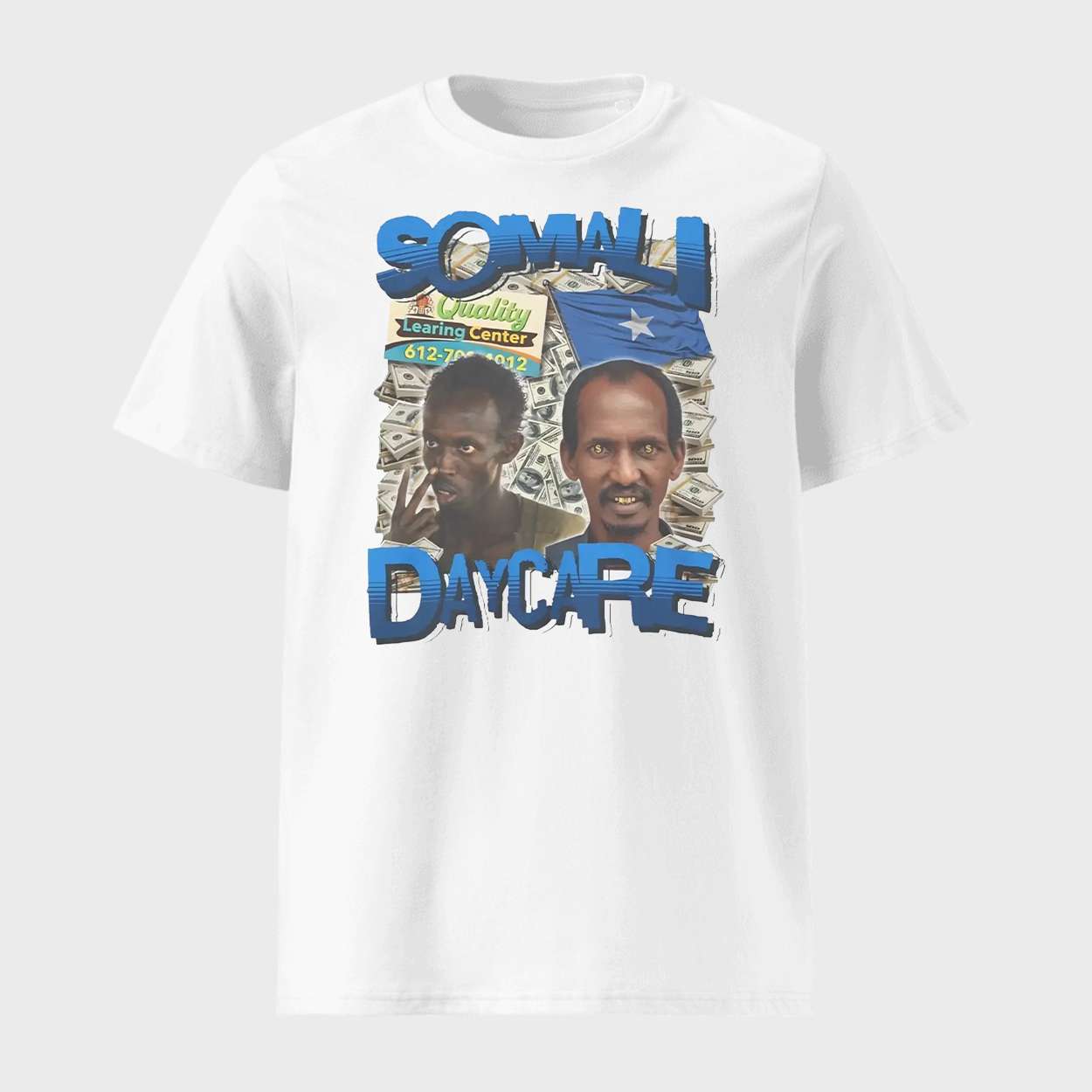 The Somali Daycare Shirt blends bold design with cultural commentary, featuring symbolic imagery and references to community entrepreneurship. This shirt sparks dialogue around identity, representation, and the evolving role of Somali-American businesses in urban spaces like Minneapolis.