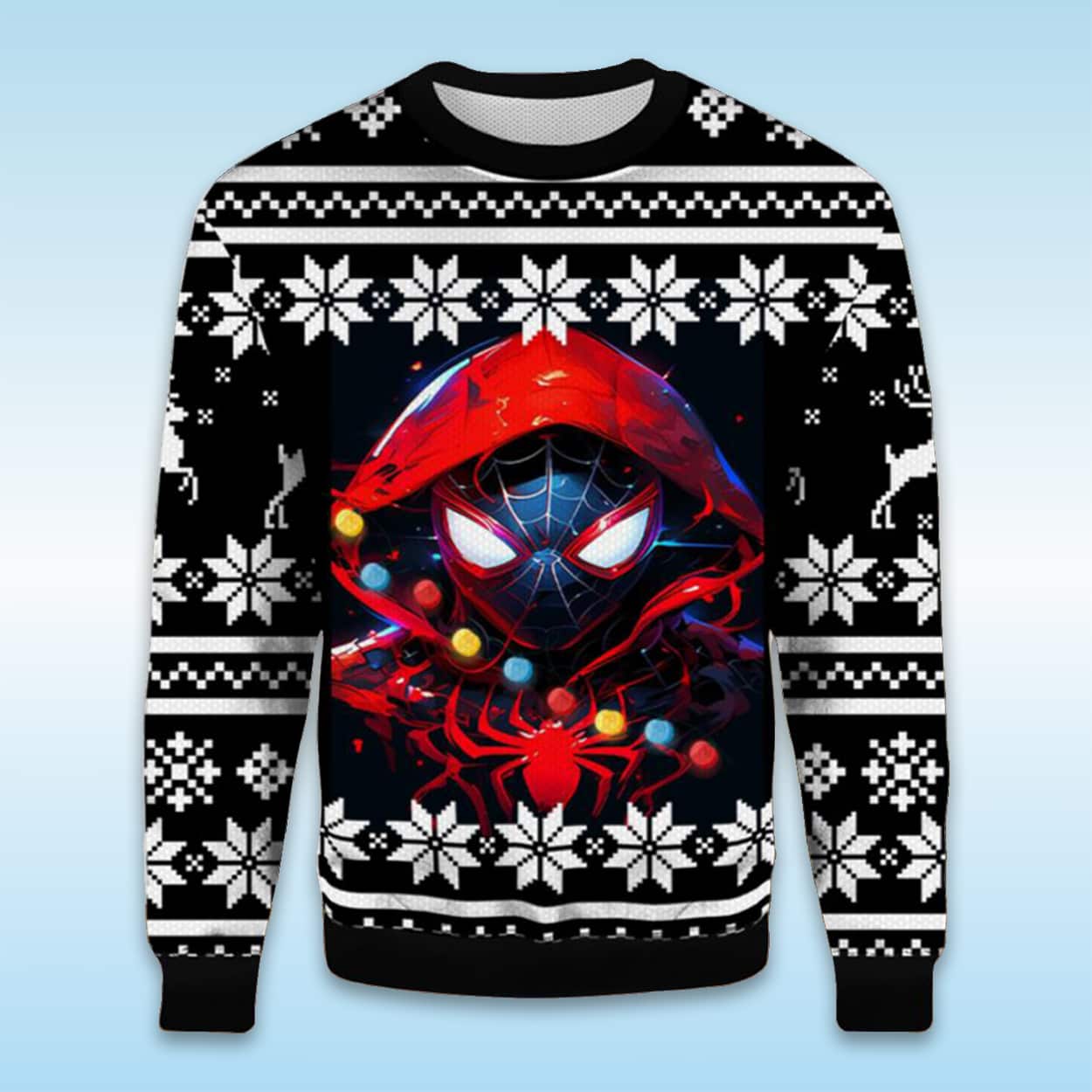 This sweater showcases Spider-Man in his iconic red hood, surrounded by glowing Christmas lights and bold winter patterns. The design pays homage to Peter Parker’s dual life—balancing heroism with humanity—making it more than just seasonal wear.