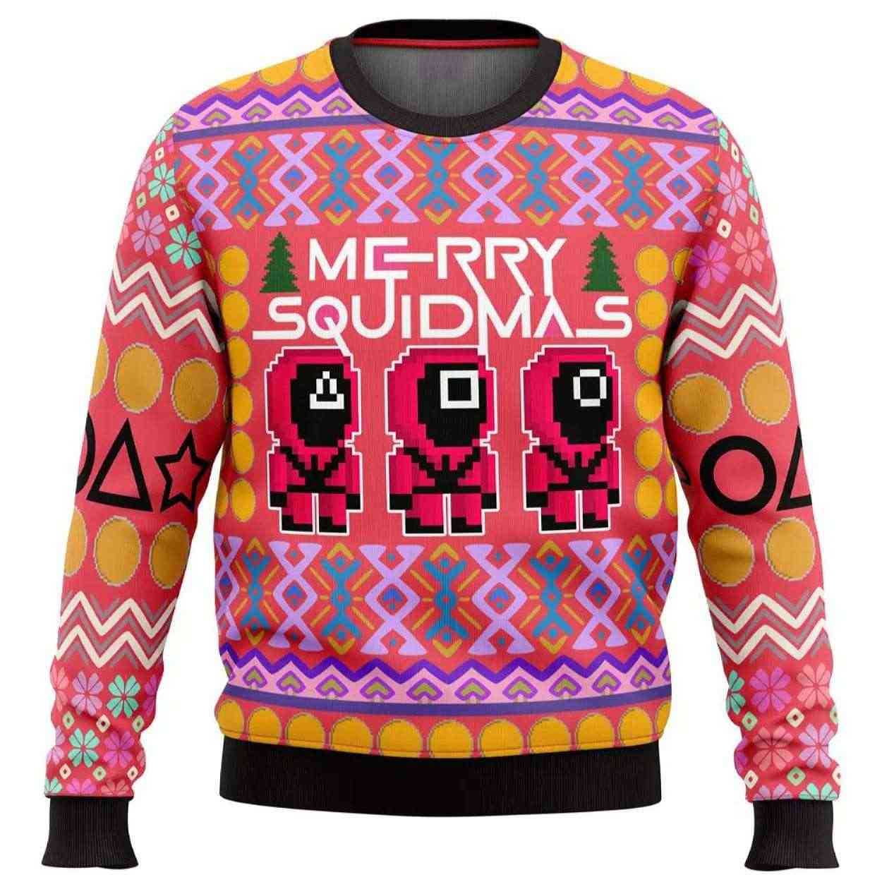 Unwrap the thrill of survival with the Squid Game Squidmas Ugly Christmas Sweater. Featuring pixelated guards and iconic symbols from the hit series, this festive design fuses pop culture with social commentaryâperfect for fans who crave bold, thought-provoking holiday wear.
