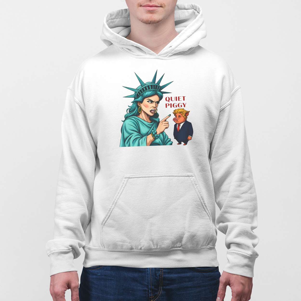 This shirt captures a viral moment from 2025 when Donald Trump told a reporter “Quiet, Piggy,” sparking widespread debate. The cartoon-style design reimagines the Statue of Liberty confronting power, turning satire into a visual protest against authoritarian tones.