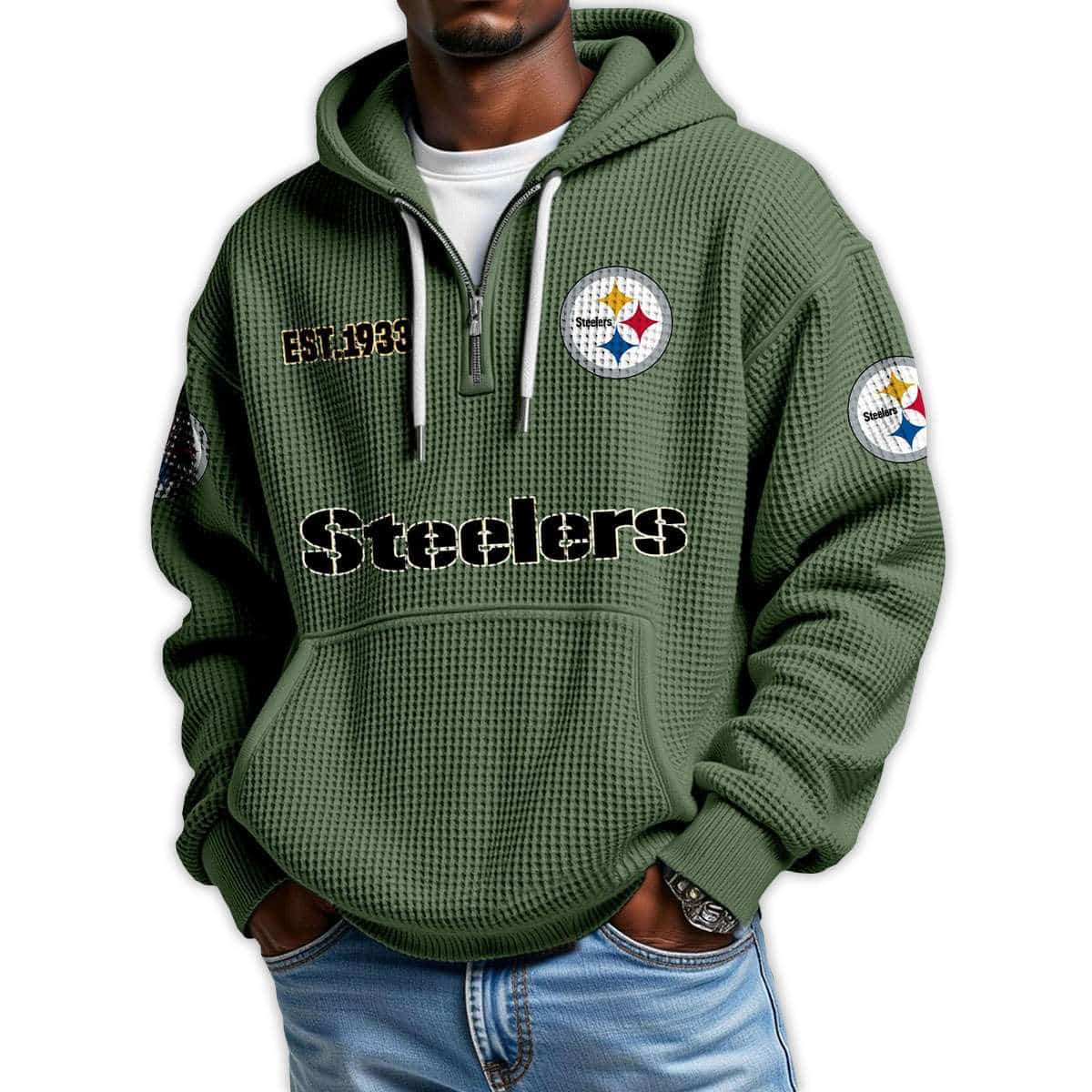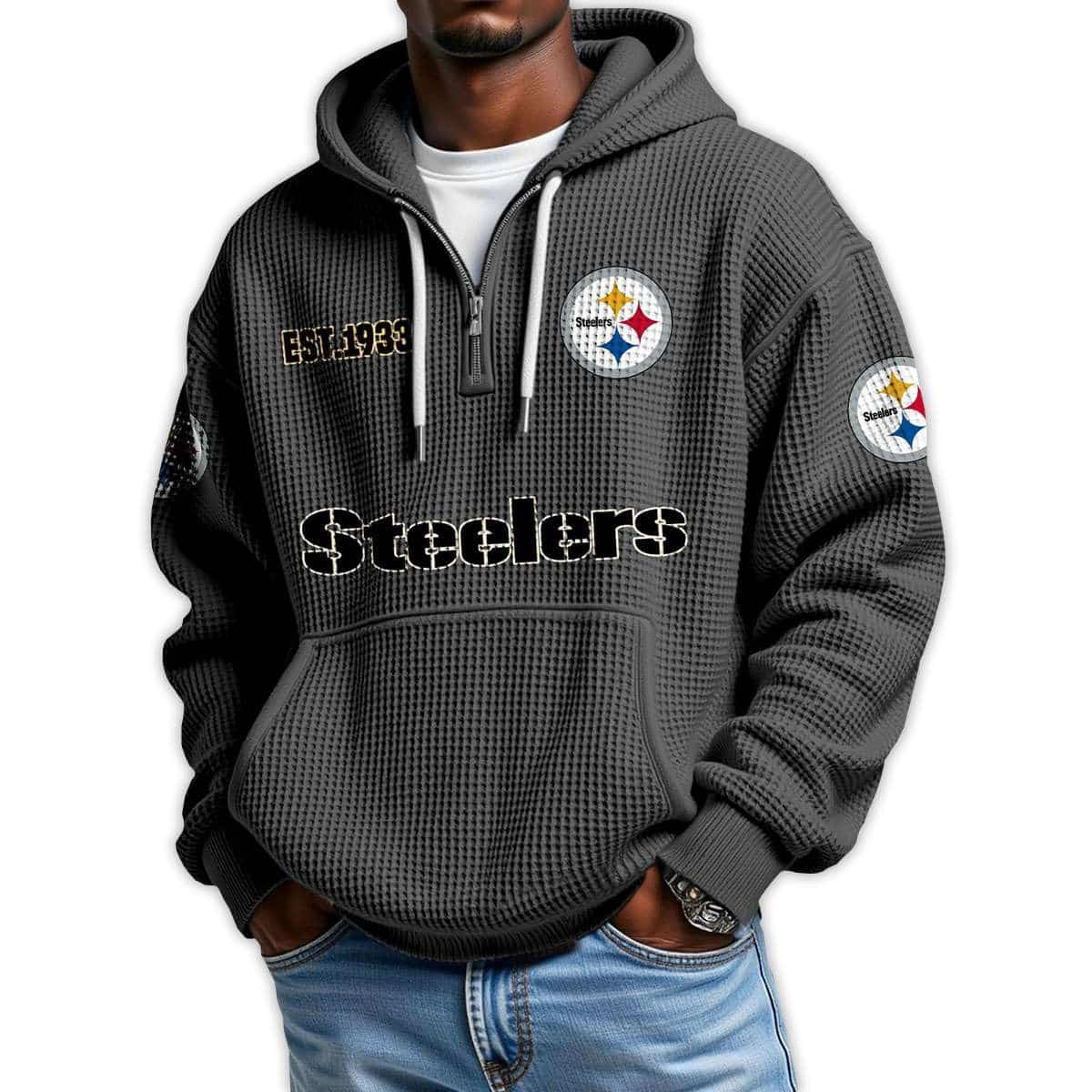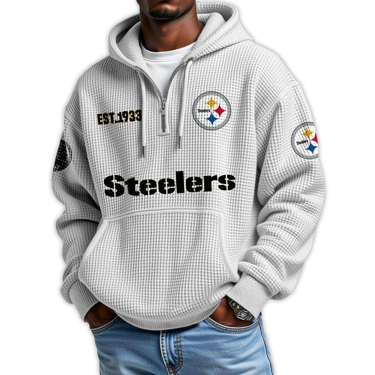 The Steelers Est 1933 Quarter Zip Waffle Hoodie honors Pittsburgh’s legacy of grit and unity. Featuring bold graphics and historic emblems, it connects iconic athletes, civic pride, and the city’s industrial roots in a design that speaks to strength and resilience.