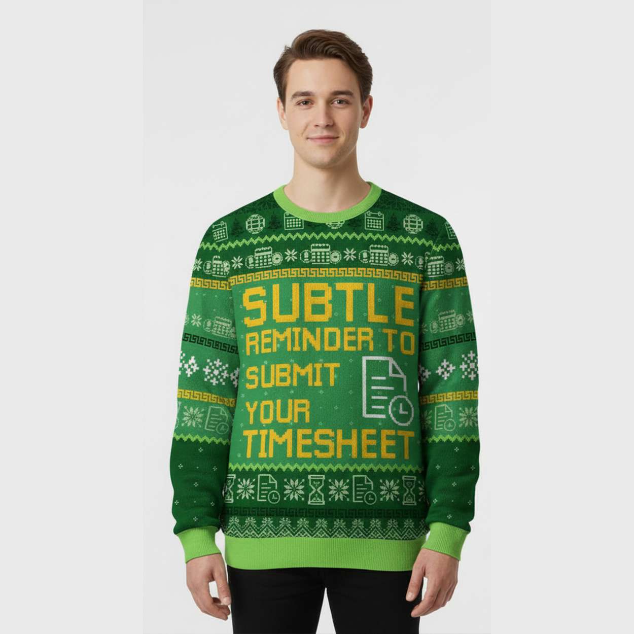 Make office humor part of your holiday wardrobe with the Subtle Reminder To Submit Your Timesheet Ugly Christmas Sweater. A witty nod to workplace culture, this festive piece blends seasonal charm with a clever nudge for time tracking accountability.