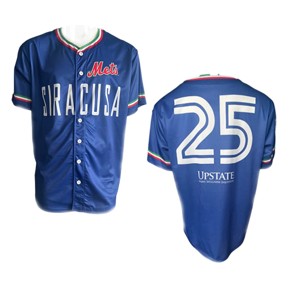 Experience Italian Heritage Night like never before with the Syracuse Mets Italian Jersey 2025 Giveaway. This royal-blue top pairs bold “Siracusa” lettering and tricolore accents with the iconic number 25, honoring Syracuse’s vibrant Italian-American community, storied baseball heroes, and Upstate University Hospital’s frontline care. Secure yours on game day, share the moment on social, and join thousands of fans already buzzing about the return of one of Central New York’s most talked-about promotions—quantities vanish fast, so plan ahead!
