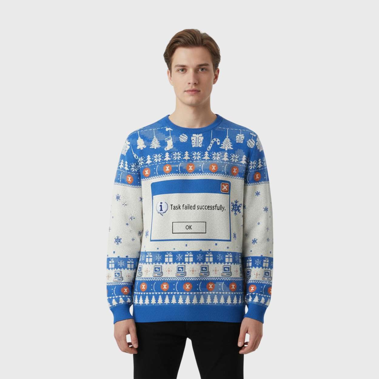 Embrace irony with the Task Failed Successfully Ugly Sweater—a witty blend of tech humor and holiday charm. Featuring a nostalgic error message and festive motifs, it’s perfect for those who love sarcasm, digital culture, and a touch of seasonal satire.