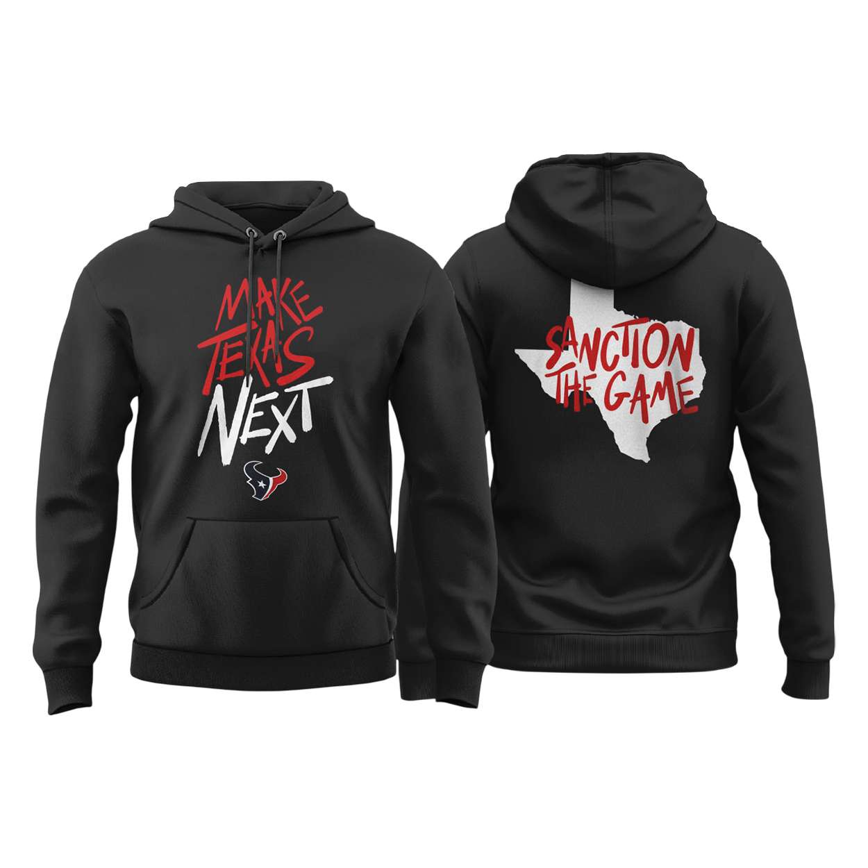 The front design, “MAKE TEXAS NEXT,” echoes the energy of Houston’s football culture and the enduring resilience of its people. Beneath it, the iconic bull head logo channels the city’s fighting spirit—an emblem of strength, unity, and ambition.