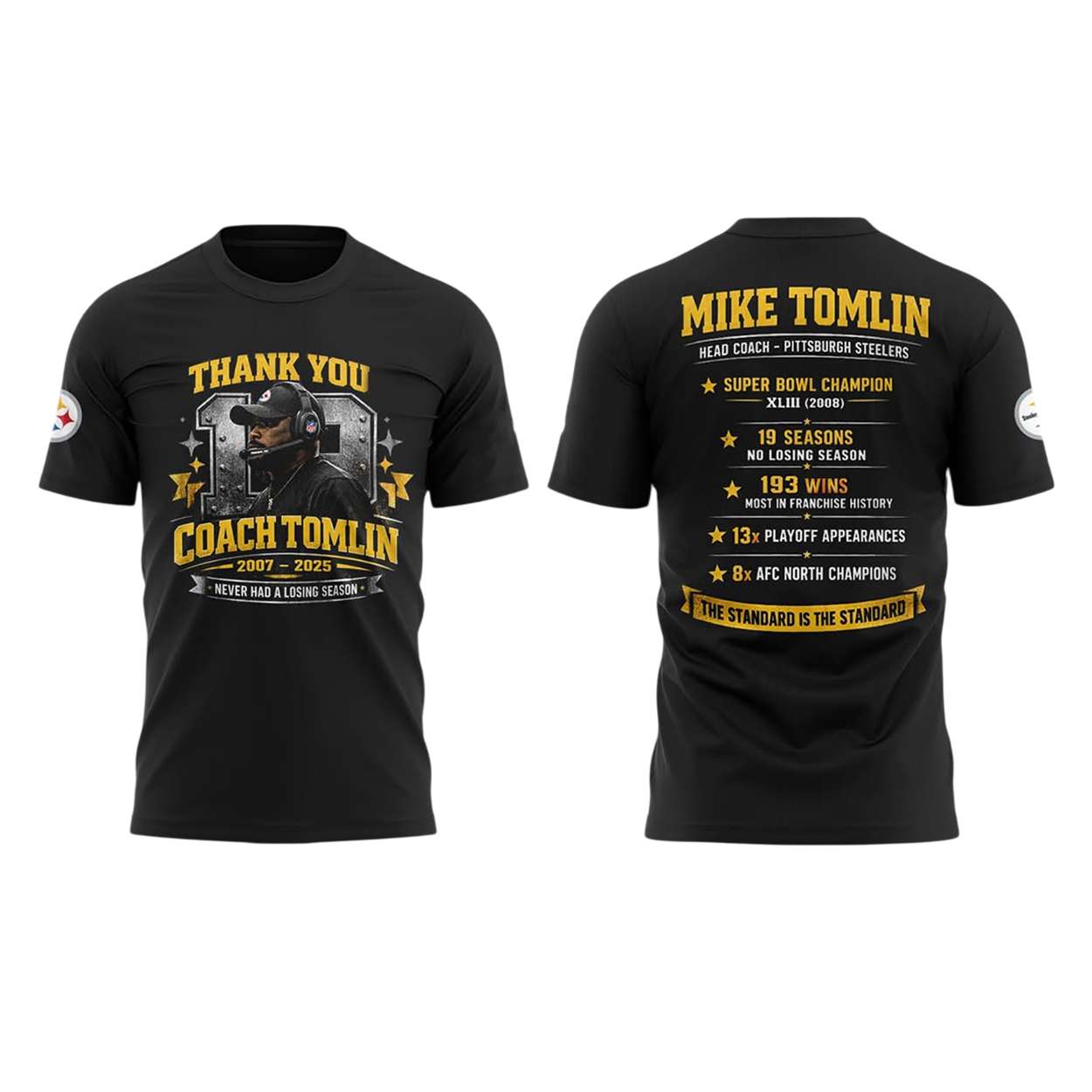 Honor the legacy of Mike Tomlin with this Thank You Coach Tomlin 2007-2025 Never Had A Losing Season Shirt. Featuring his unmatched record of 19 seasons without a losing year, this tribute captures the essence of leadership, resilience, and Pittsburgh pride. A must-have for true fans.