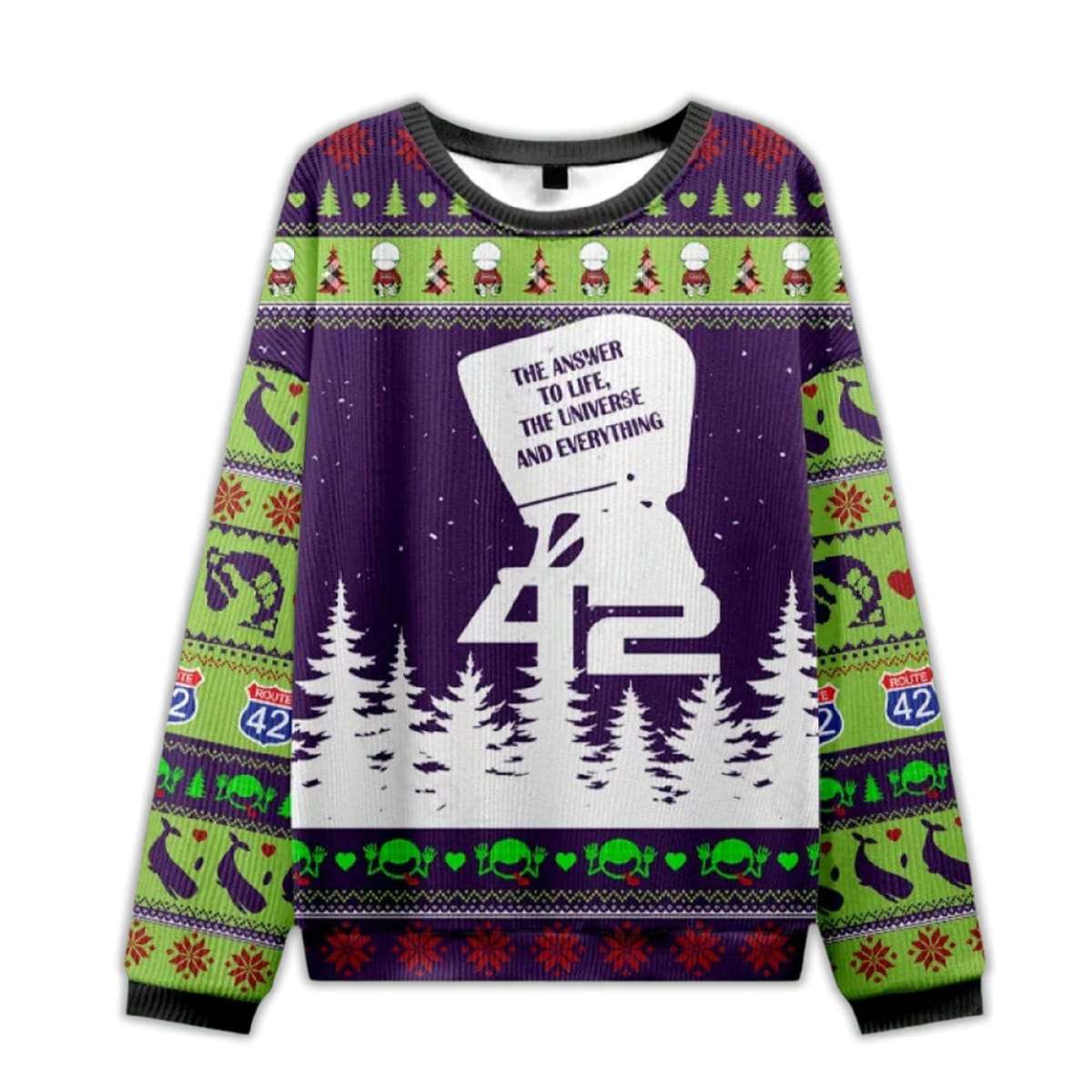 The Answer To Life The Universe And Everything Ugly Christmas Sweater brings sci-fi wit to holiday wear. Featuring the iconic number 42, it’s perfect for fans of Douglas Adams, deep thinkers, and anyone who enjoys cosmic humor with a festive twist.