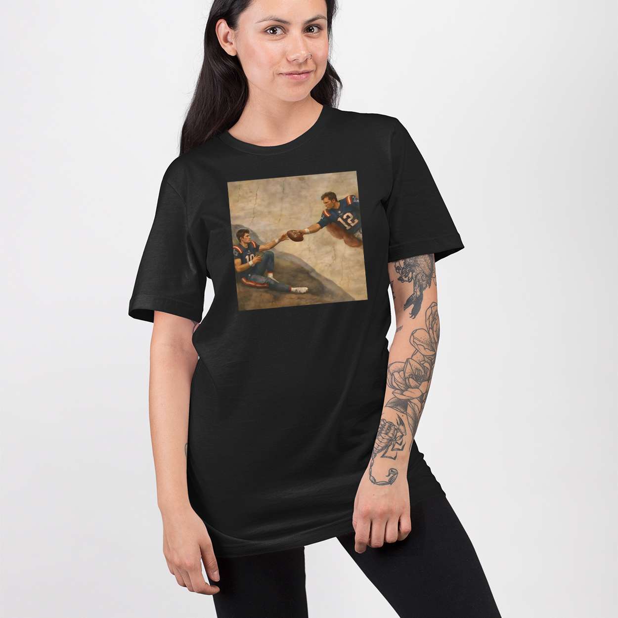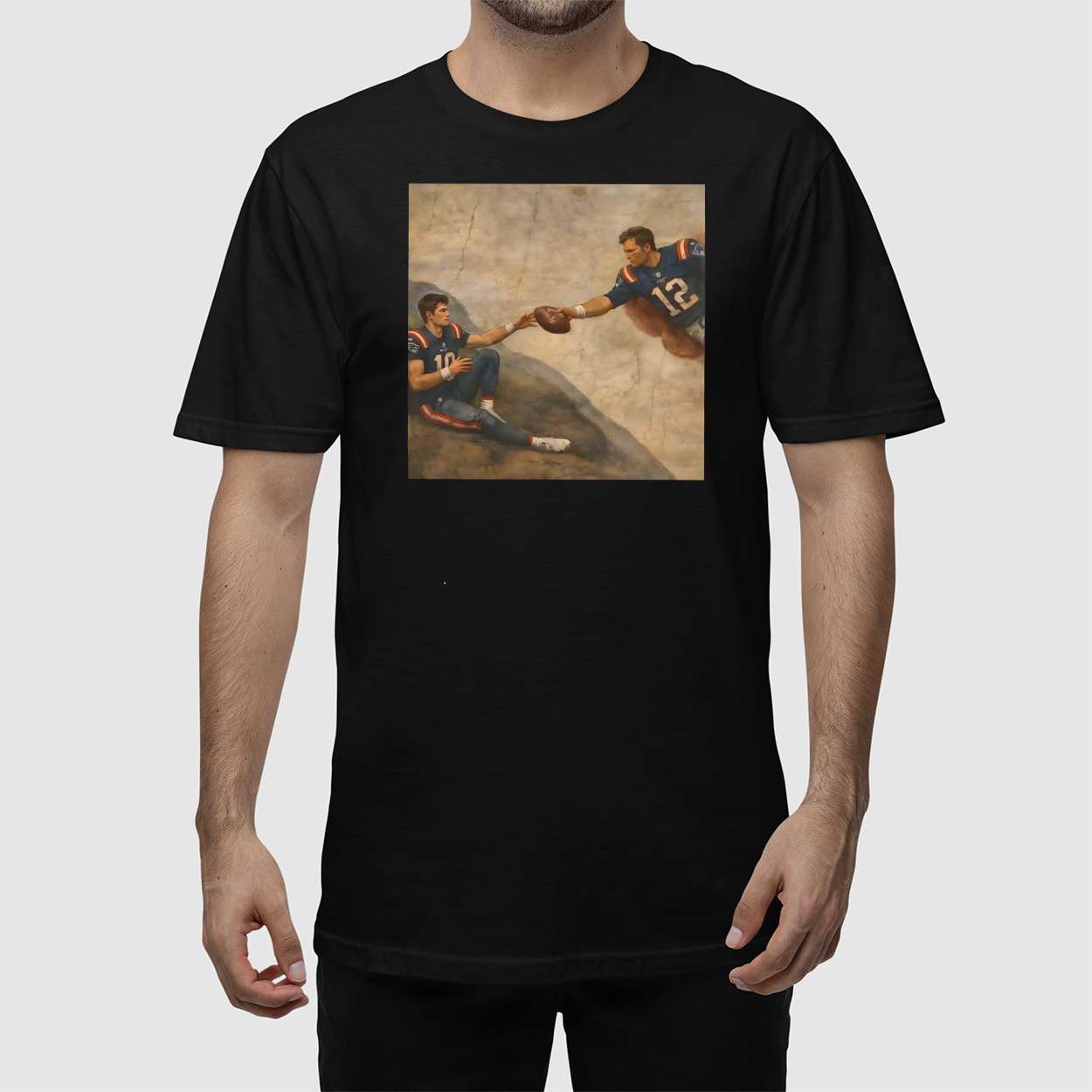 Inspired by Michelangelo’s masterpiece, this shirt reimagines “The Creation of Adam” with Tom Brady extending a football to Drake Maye. It’s a visual metaphor for mentorship, transition, and the enduring influence of sports legends on rising talent.