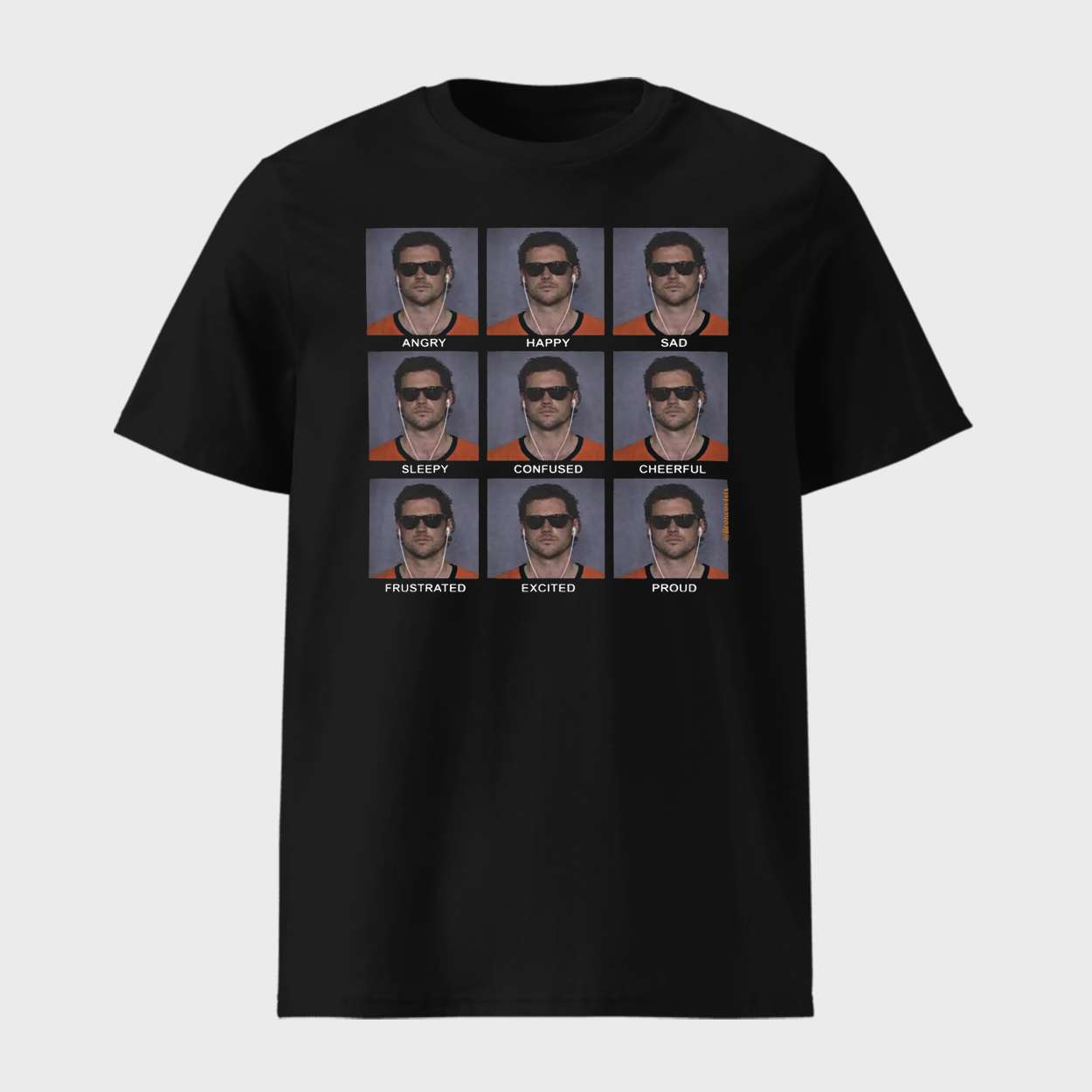 This shirt captures Jarrett Stidham’s iconic calm through nine identical expressions labeled with contrasting emotions. It’s a clever nod to his unshakable demeanor, often noted during high-pressure moments on the field and in interviews.