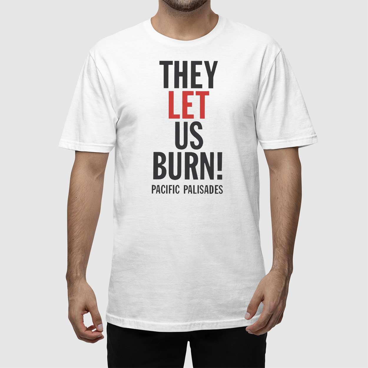 The phrase “They Let Us Burn” echoes the anguish of Pacific Palisades residents during the 2025 wildfires, when delayed emergency responses left neighborhoods vulnerable. This shirt channels that frustration into a visual protest, amplifying voices that were silenced amid the smoke.