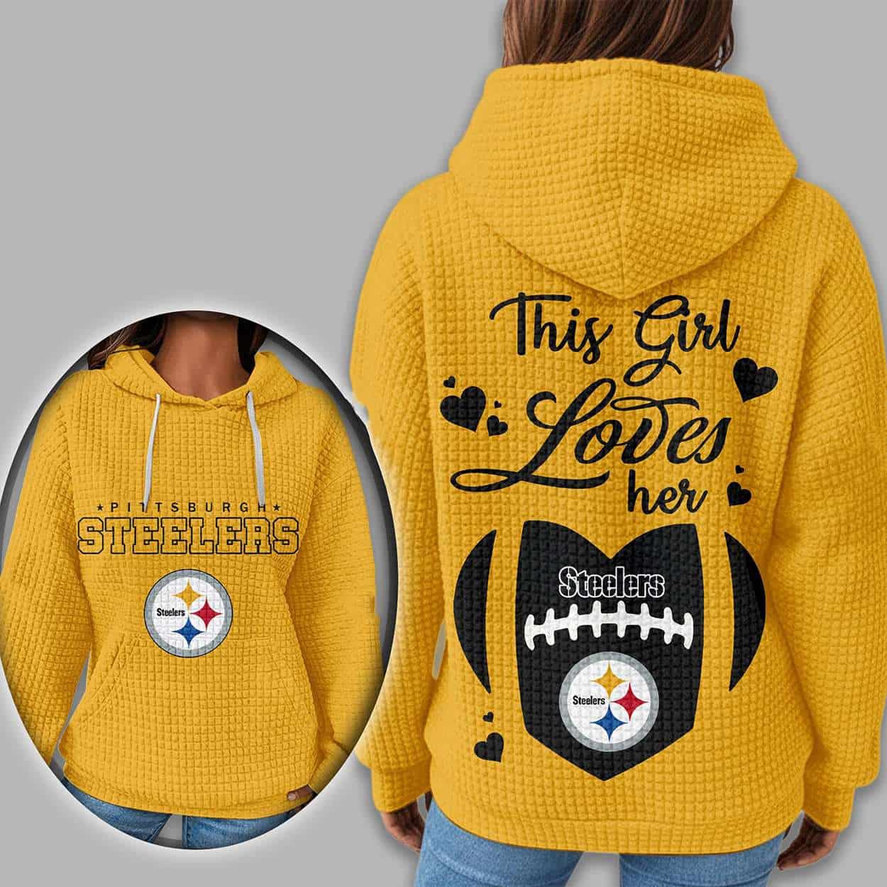 Show your Pittsburgh pride with the This Girl Loves Her Steelers Waffle Hoodie. Featuring bold graphics and heartfelt messaging, this hoodie connects fashion with football legacy, empowering fans through iconic imagery and historical team spirit. A must-have for true Steelers devotees.