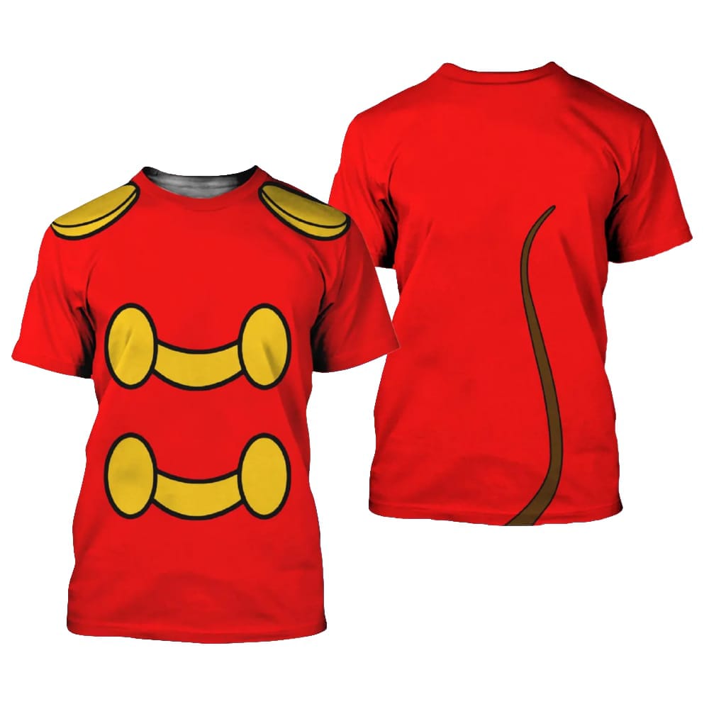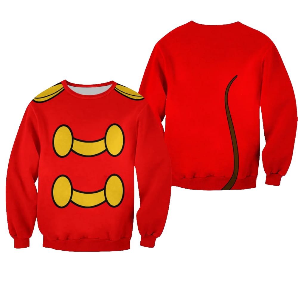 The vivid red design mirrors Timothy’s circus uniform, complete with golden details and playful tail artwork. The hood carries his face, instantly recognizable to fans of classic Disney animation and those who appreciate timeless characters.