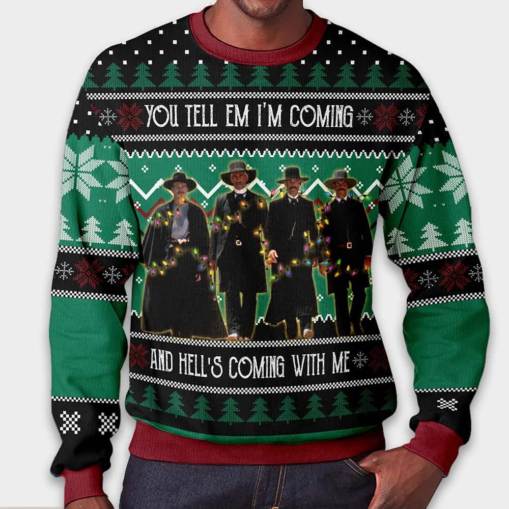 Channel the fearless spirit of Tombstone with this Tombstone You Tell Em I’m Coming And Hell’s Coming With Me Ugly Christmas Sweater. Featuring Doc Holliday and Wyatt Earpās legendary stand, it combines holiday humor with Old West grit. Perfect for fans of history, Western films, and bold statements.