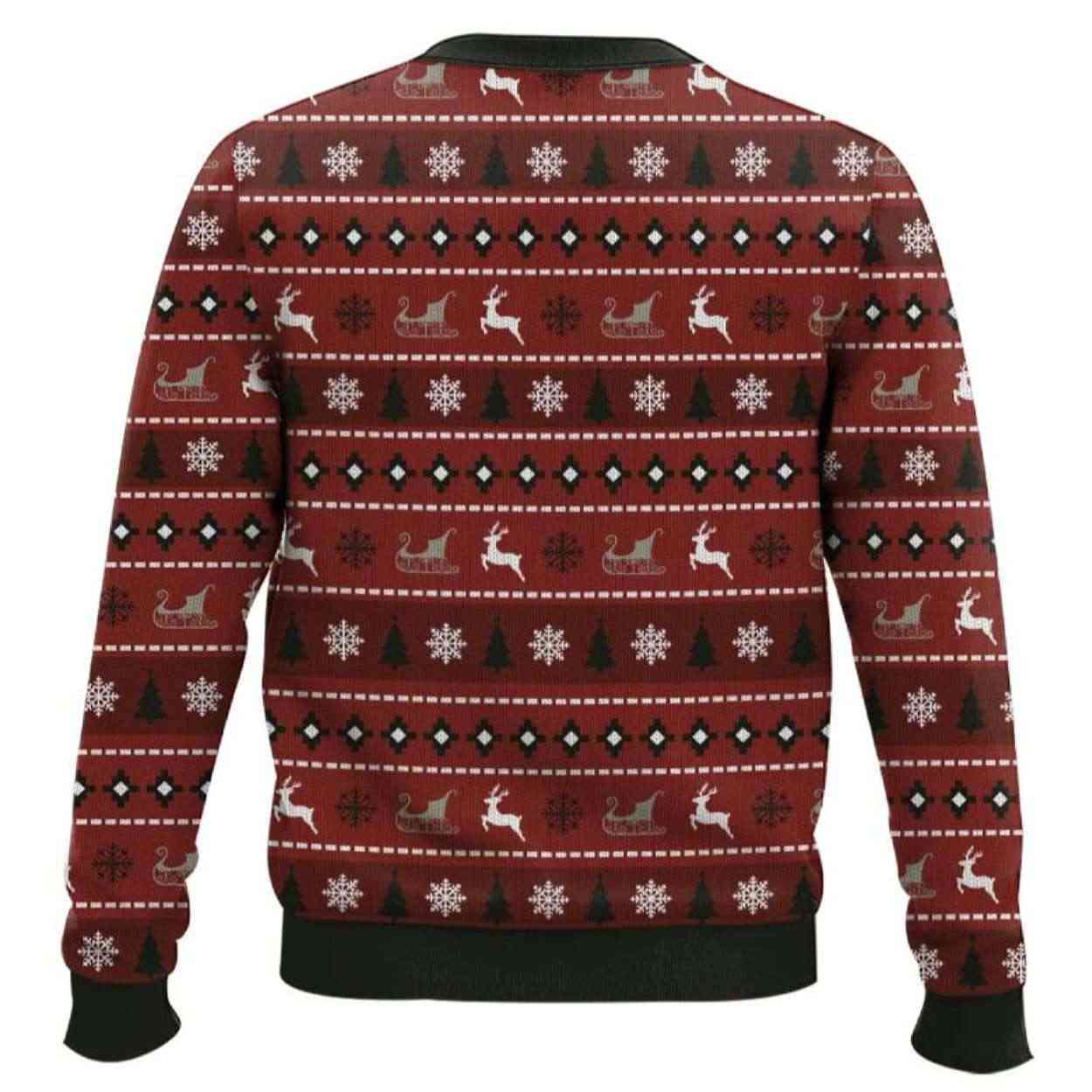 The design captures the gritty spirit of 1980s Miami crime drama, contrasting its violent legacy with a festive knit pattern of snowflakes, reindeer, and holiday motifs. It’s a visual clash of excess and irony, perfectly suited for those who enjoy fearless expression during the merriest season.