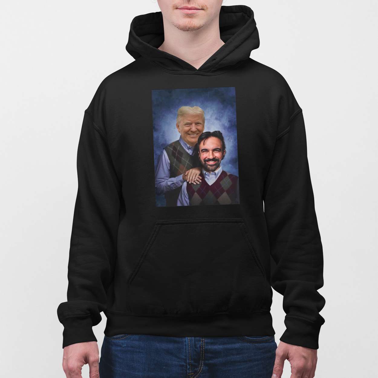 In a surreal twist on pop culture, this shirt features Donald Trump and Zohran Mamdani styled like iconic portrait buddies. The image riffs on their unlikely handshake at the White House, a moment that stunned both critics and supporters.