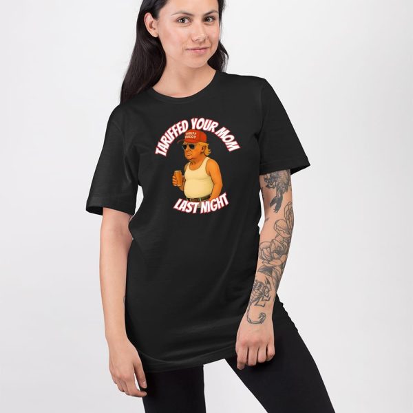 The phrase “Tariff Daddy” is a reference to the nickname some critics gave Trump due to his unapologetic stance on imposing tariffs. This shirt plays on that term, combining it with the provocative phrase “Tariffed Your Mom Last Night,” creating a piece that speaks to both his divisive personality and the real-world consequences of his policies. The character depicted on the shirt exaggerates Trump’s signature look, complete with his casual style and confident stance, making the shirt a humorous yet pointed critique.