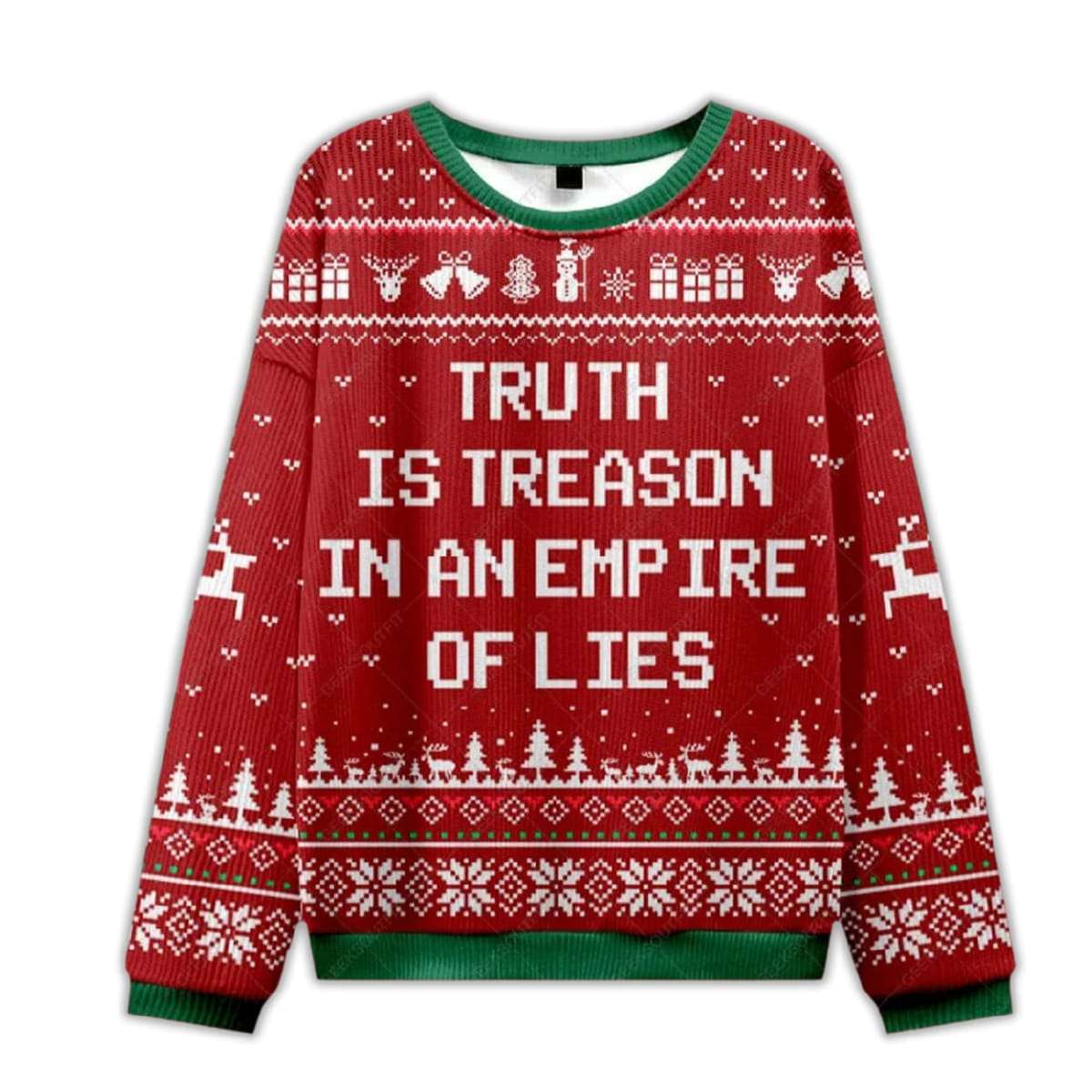 Make a bold statement with the Truth Is Treason In An Empire Of Lies Ugly Christmas Sweater. This provocative design channels political dissent, historical resistance, and the courage to speak out—perfect for free thinkers, activists, and those who challenge the status quo.