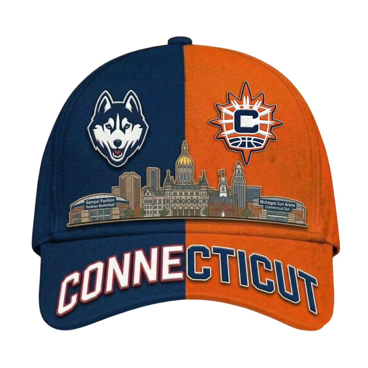 The illustrated Capitol skyline ties the cap to Connecticut’s cultural identity, recalling moments when sports brought communities together under one banner. It highlights the state’s role as a hub of basketball excellence and civic pride, bridging tradition with modern fandom.