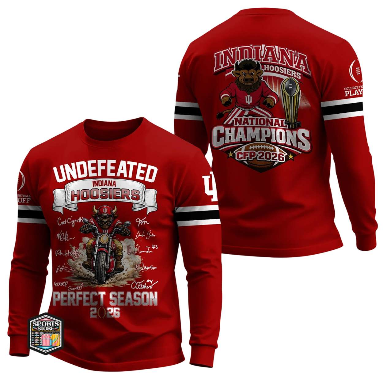 Honor Indiana University’s legendary 2026 football triumph with this Undefeated Indiana University Perfect Season National Champions 2026 Shirt featuring undefeated season graphics, iconic characters, and national championship pride. A tribute to grit, unity, and the Hoosiers’ rise to College Football Playoff glory.