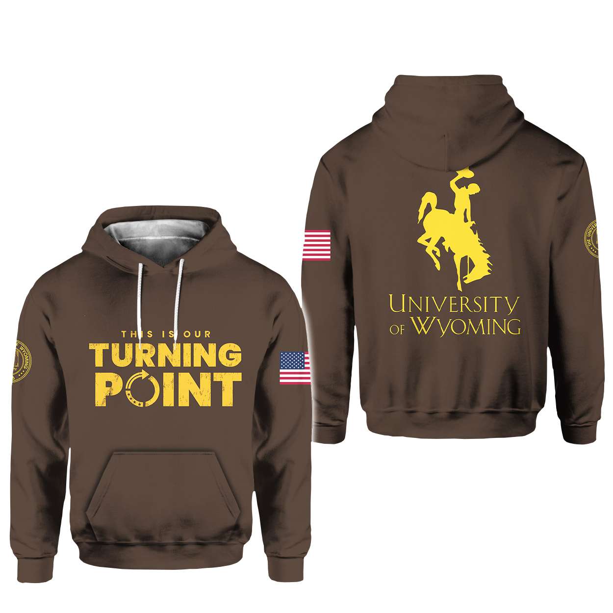 With the American flag on the sleeve, this hoodie links university identity to national ideals. It’s a tribute to students, veterans, and changemakers who see Wyoming not just as a place, but as a purpose-driven journey.