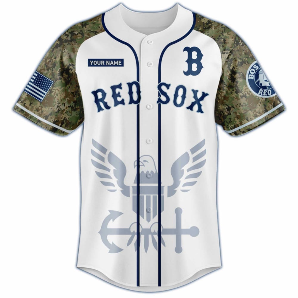 The jersey’s design incorporates elements inspired by the Navy, including anchors and the emblematic eagle, which reflect the strength and resilience of the men and women in uniform. The camo-sleeve detailing symbolizes military tradition, while the classic Red Sox logo on the chest brings fans of all ages into the fold, making it a must-have for collectors of military and sports memorabilia.