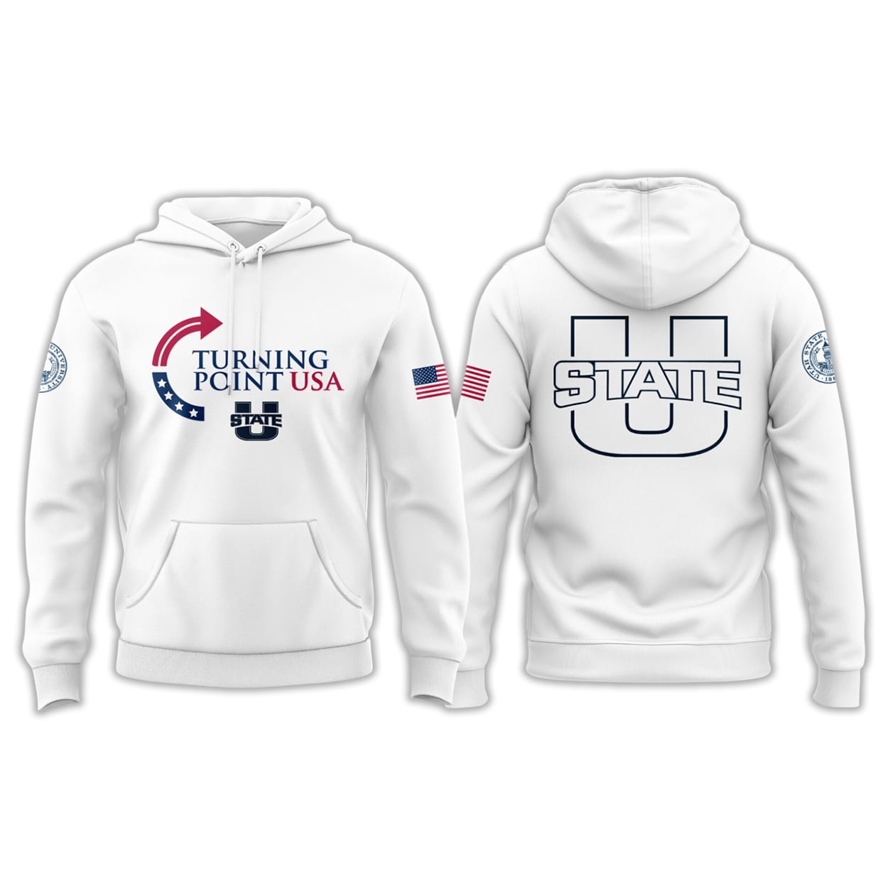 Emblazoned with the “U-State” insignia and Turning Point USA branding, the shirt merges university identity and a movement’s mission. It stands as a reminder that students and citizens continue to negotiate rights, responsibility, and the role of voice in democracy.