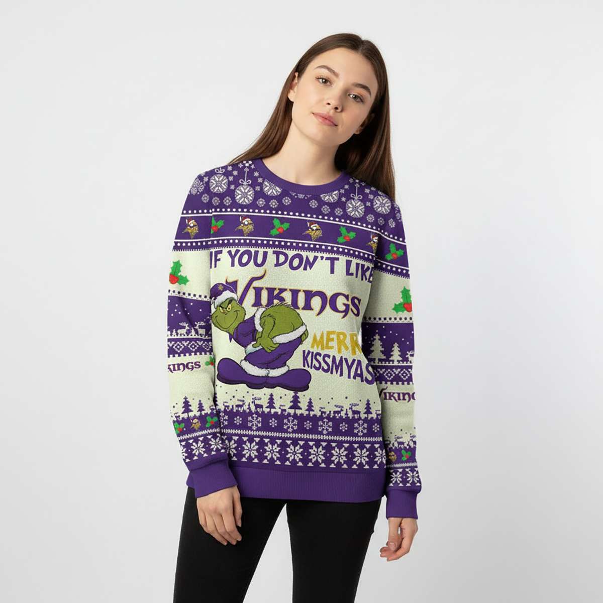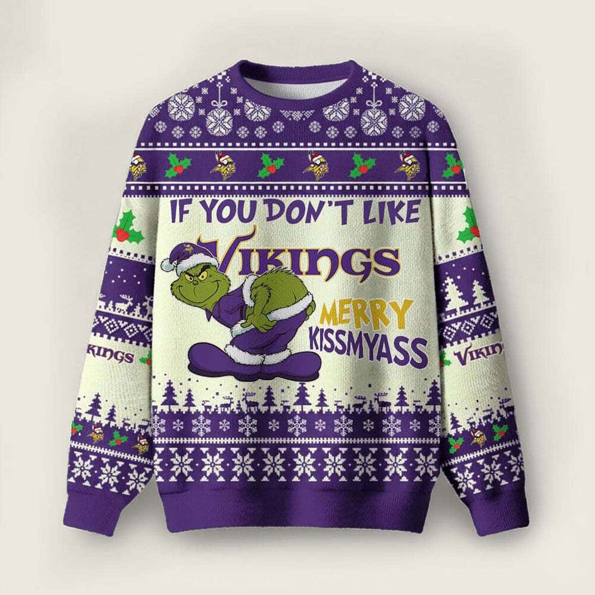 Turn heads this winter with the Vikings Grnch Merry Kissmyass Ugly Sweater. Featuring a cheeky Grinch in purple and bold Minnesota Vikings flair, this design blends holiday humor, pop culture rebellion, and football pride into one unforgettable statement piece.