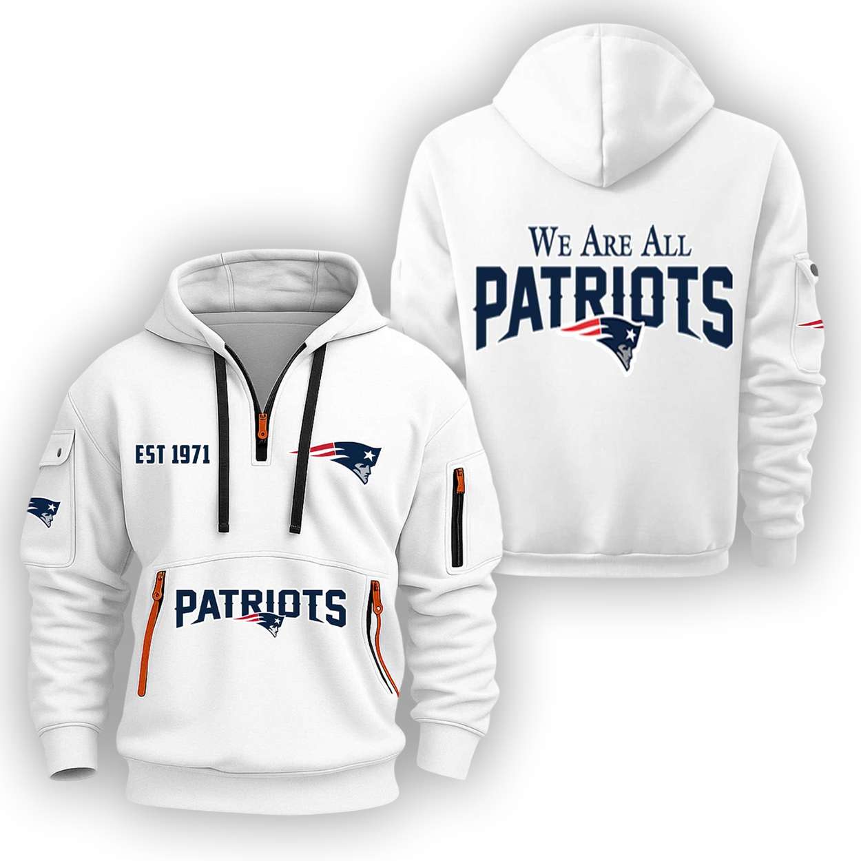 Show your pride with the We Are All Patriots Est 1971 Quarter Zip Hoodie. Featuring iconic slogans and historic emblems, this hoodie honors unity, legacy, and the enduring spirit of New England. A bold tribute to shared values and timeless grit.