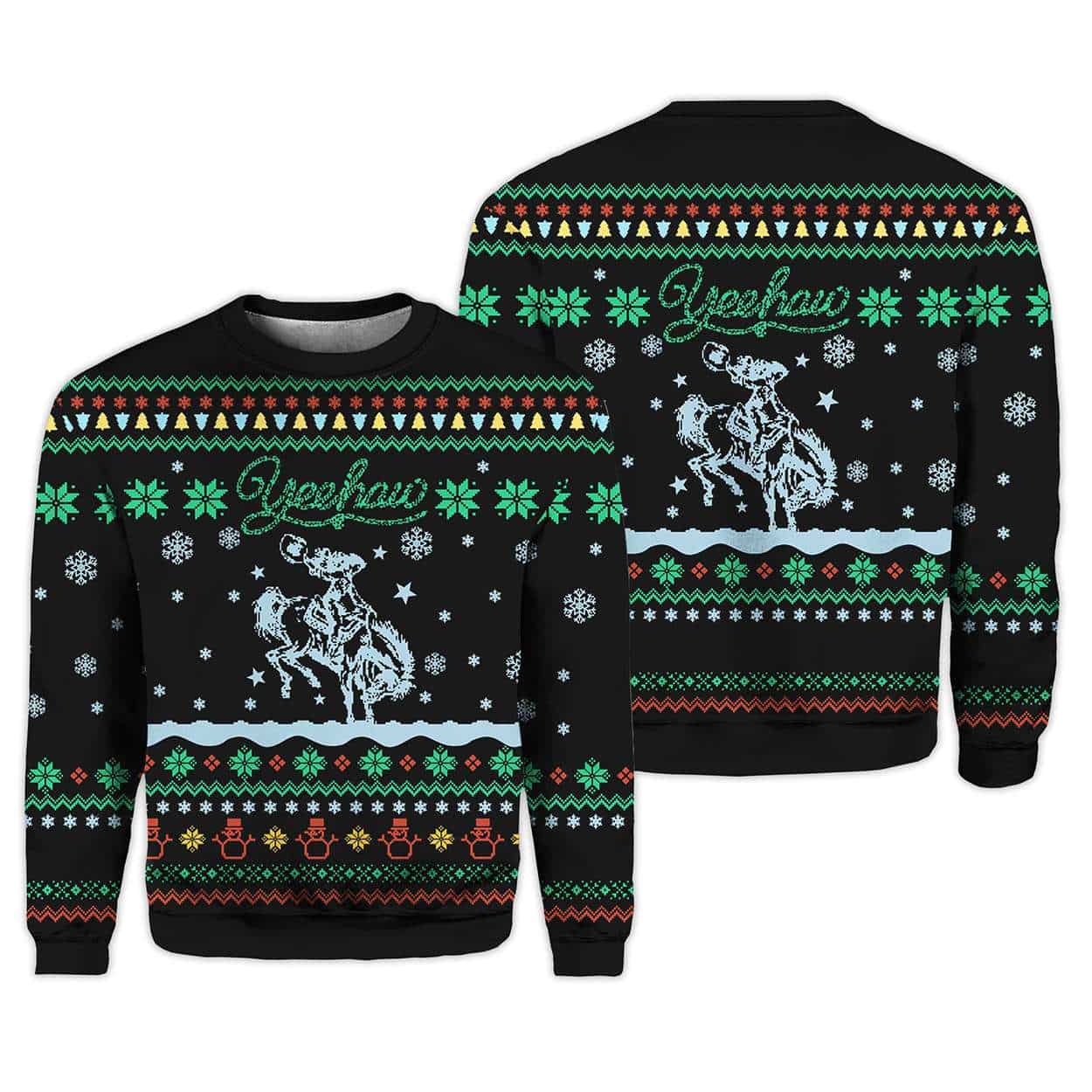 Saddle up for seasonal flair with the Wild West Winter Wonderland Ugly Christmas Sweater. Featuring a bucking cowboy, snowflakes, and festive Western motifs, this design blends holiday cheer with frontier grit and Americana storytelling in one unforgettable garment.