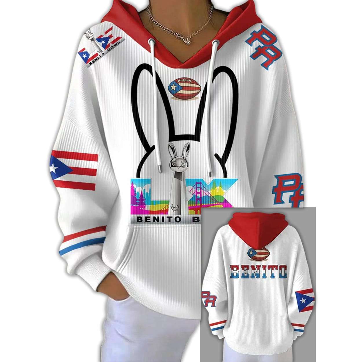 Bold, expressive, and rooted in culture—the Women’s Bunny Football Music Lover Printed Hoodie fuses Puerto Rican pride, Bad Bunny’s iconic persona, and the rhythm of urban life. A wearable tribute to music, sport, and identity that sparks conversation.
