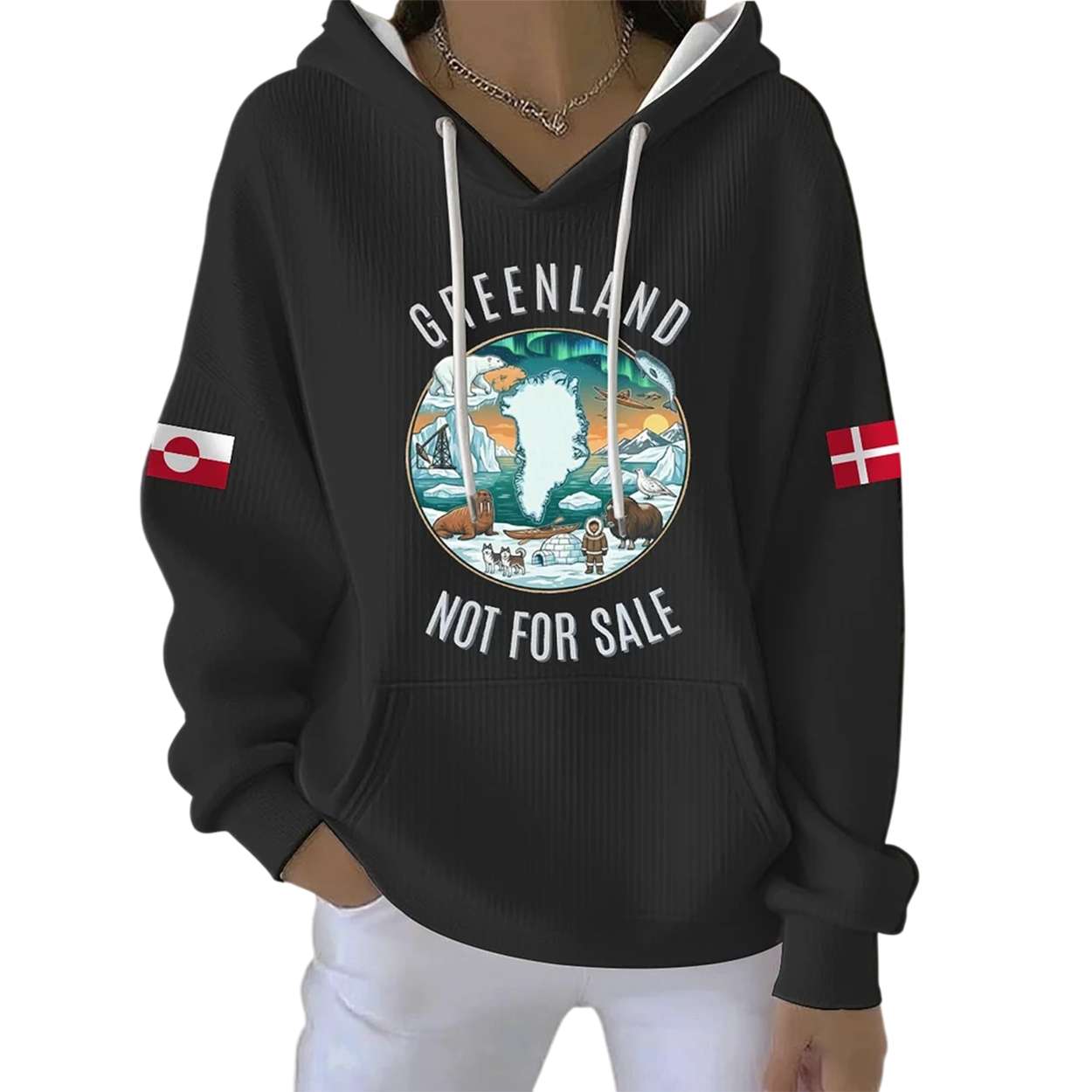 Flags of Denmark and Greenland stitched on the sleeves represent a complex colonial relationship. The hoodie invites wearers to stand with a community striving for self-determination amid global power struggles and climate threats.
