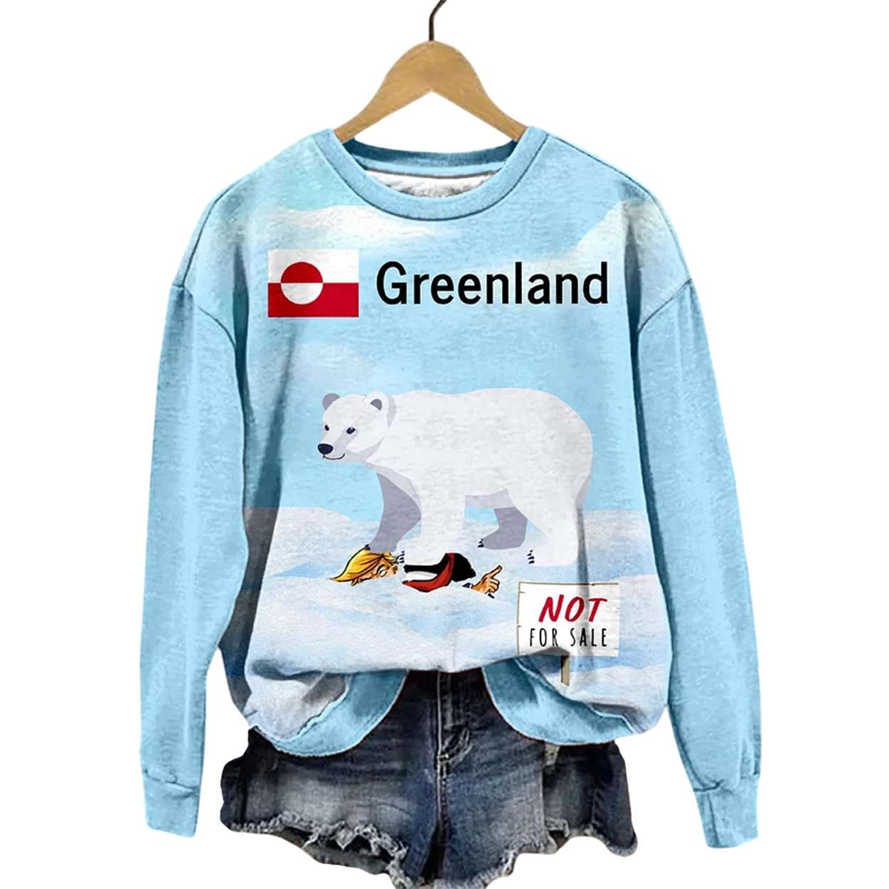 Make a bold statement with the Women’s Greenland Not For Sale Print Sweatshirt. Featuring Greenland’s flag, polar bear imagery, and satirical art, this design reflects environmental awareness and resistance to exploitation. A wearable voice for sovereignty, climate justice, and cultural respect.