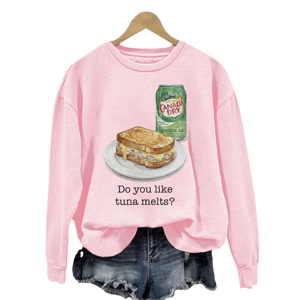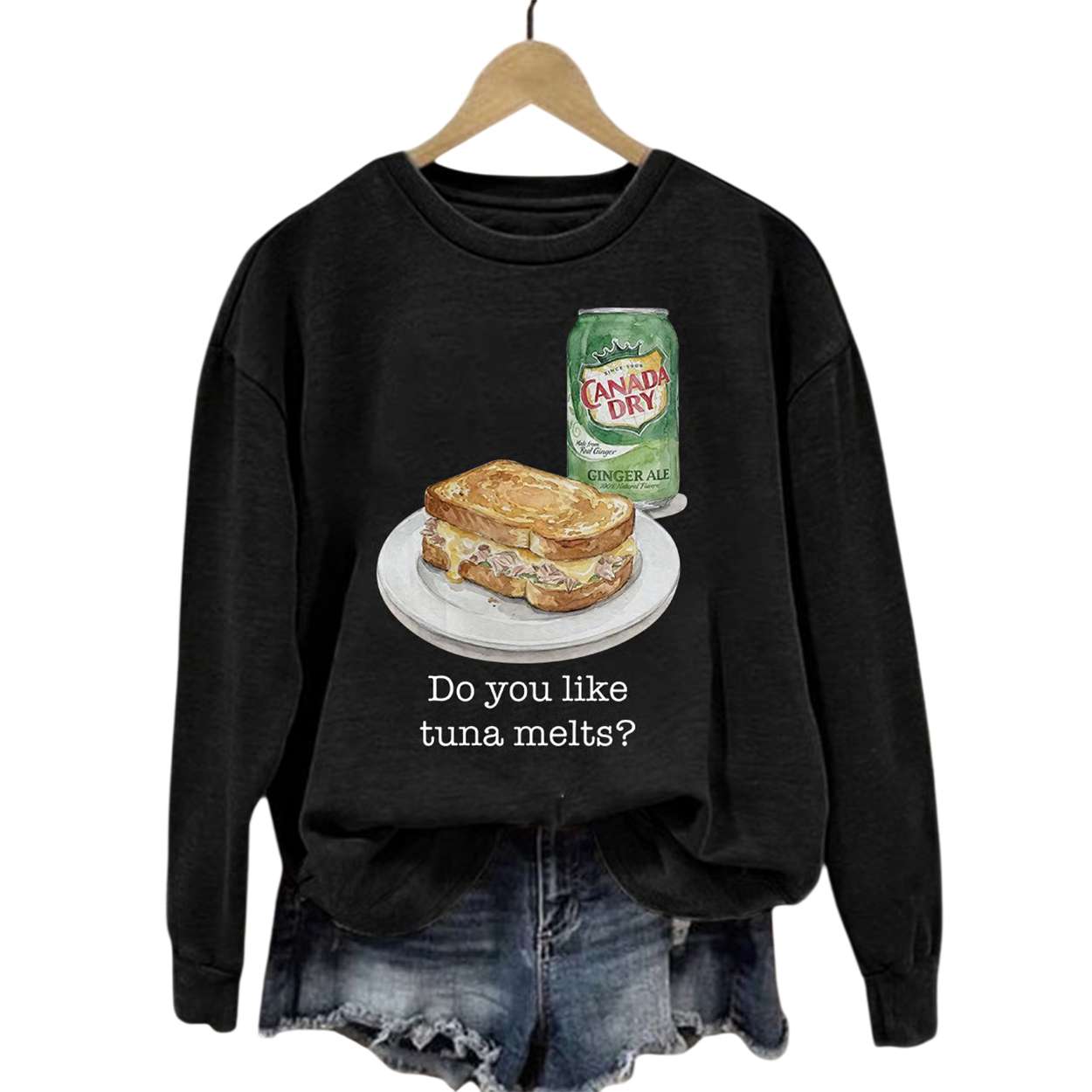 This sweatshirt features a whimsical illustration of a tuna melt sandwich paired with a Canada Dry Ginger Ale—an homage to mid-century diner culture. It evokes the golden age of American lunch counters, where comfort food and fizzy drinks shaped social rituals.