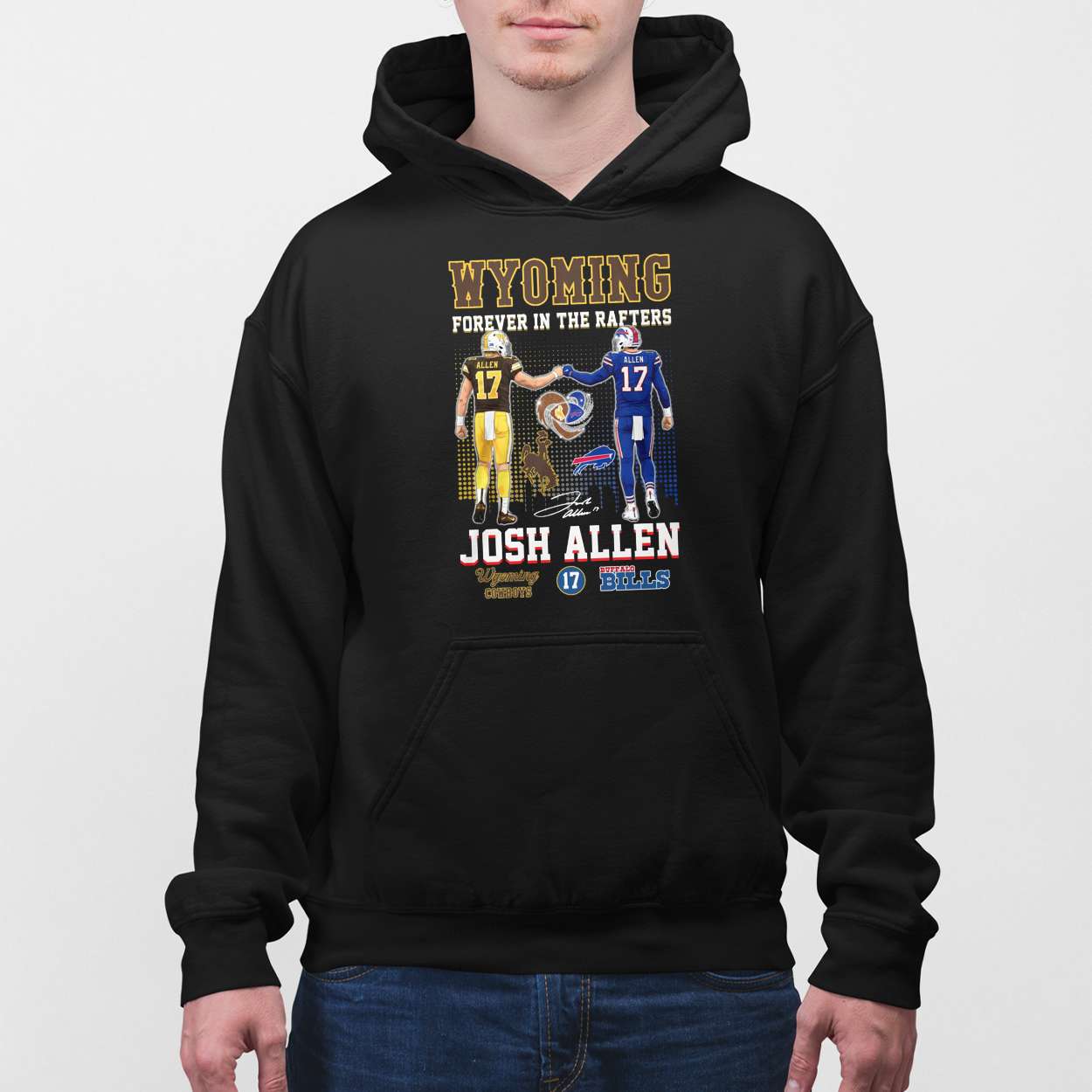 Honor the journey of Josh Allen from Wyoming Cowboys standout to Buffalo Bills icon with this Wyoming Forever In The Rafters Josh Allen Bills Shirt. Featuring bold artwork and historical nods, it’s a tribute to grit, growth, and gridiron greatness. A must-have for true fans.