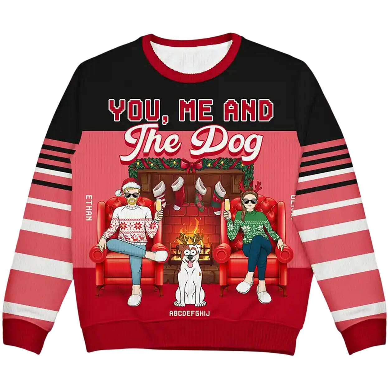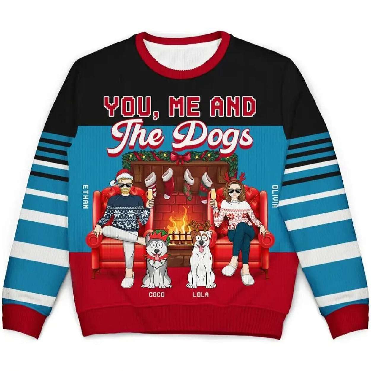 Ethan and Olivia sit side by side in plush red armchairs, shaded by flickering firelight and framed by stockings overhead. Their dogs, Coco and Lola, rest loyally at their feet. This sweater immortalizes quiet moments of connection, laughter, and unconditional love.