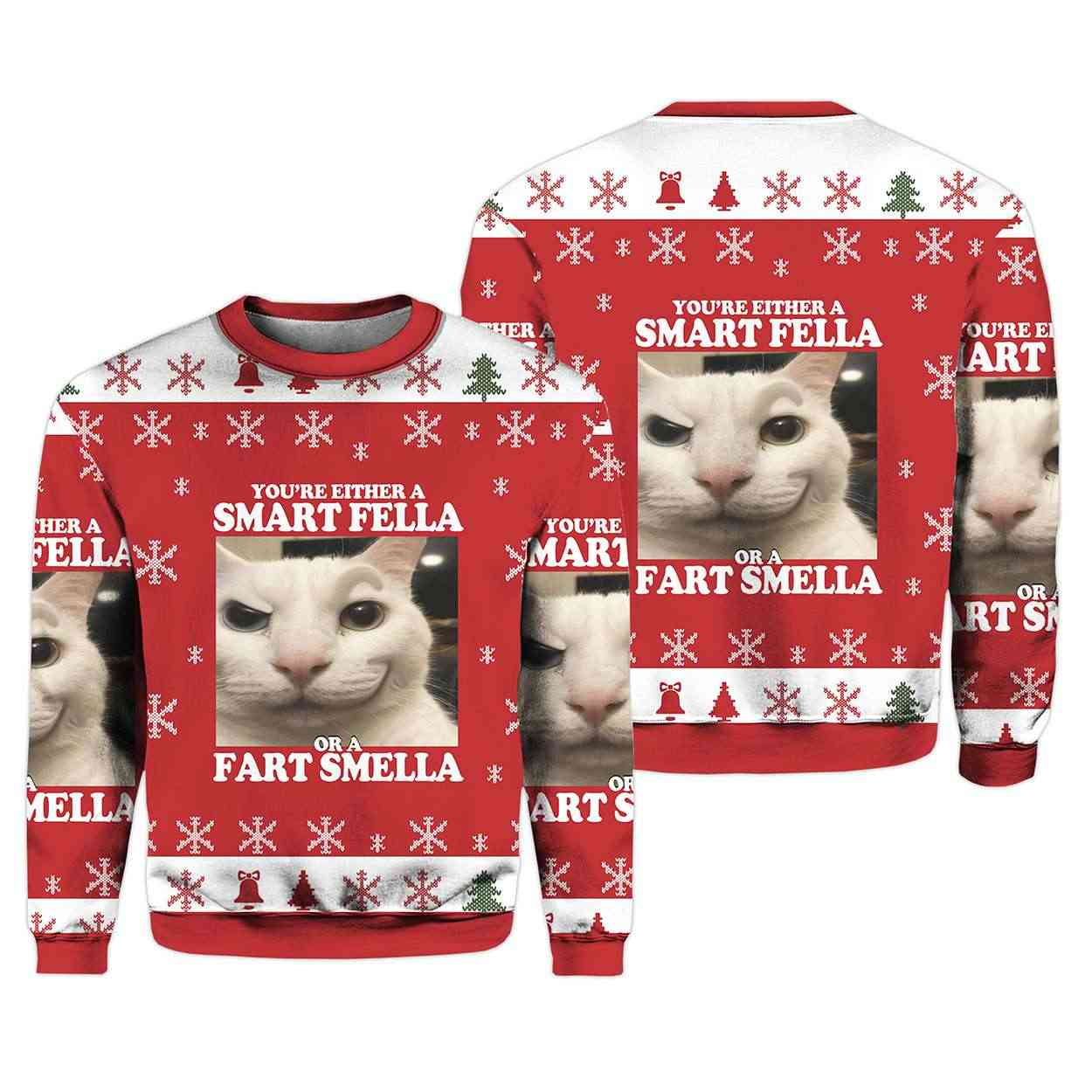 Add a dash of mischief to your wardrobe with the You’re Either A Smart Fella Christmas Ugly Sweater. Featuring a cheeky cat and clever wordplay, this design blends holiday humor with internet culture, making it a standout choice for bold personalities and meme lovers.